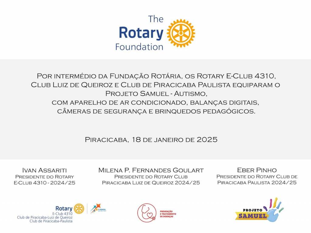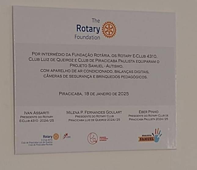 Em uma ação solidária que reflete o compromisso com a inclusão e o bem-estar das crianças, os Rotary Clubs de Piracicaba Luiz de Queiroz, Paulista e E-Club 4310 com verba da Fundação Rotária, por meio do Subsídio Distrital realizaram a doação de equipamentos essenciais para o Projeto Samuel - Autismo. Foram doados aparelho de ar condicionado, câmeras de segurança, brinquedos sensoriais e balanças digitais. Esta iniciativa é um passo significativo na luta pela conscientização e pelo tratamento adequado de crianças com Transtorno do Espectro Autista (TEA).