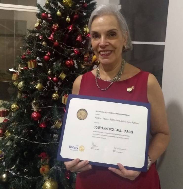 Pelas contribuições à Fundação Rotária, foram entregues, durante a reunião, quatro premiações. O companheiro Edson Tambelli recebeu a quarta safira e numa ação inédita no nosso clube foram agraciadas com o título Paul Harris três gerações de uma mesma família: Maria de Lourdes Ferreira Castro (em memória), sua filha a c. Regina Maria Ferreira Castro Abu Jamra e sua neta a c. Flavia Abu Jamra de Oliveira. Apesar de não ter sido rotariana, a sra. Maria de Lourdes teve a sua vida pautada nos mesmos valores difundidos pelo Rotary, como ficou bem demonstrado no vídeo feito pela sua neta Flavia e apresentado na reunião. Segundo a c. Regina, sua mãe “sempre deu de si, antes de pensar em si”.