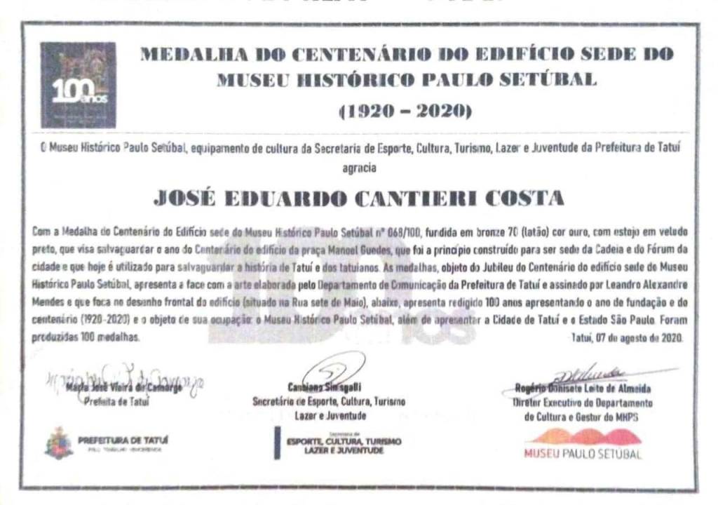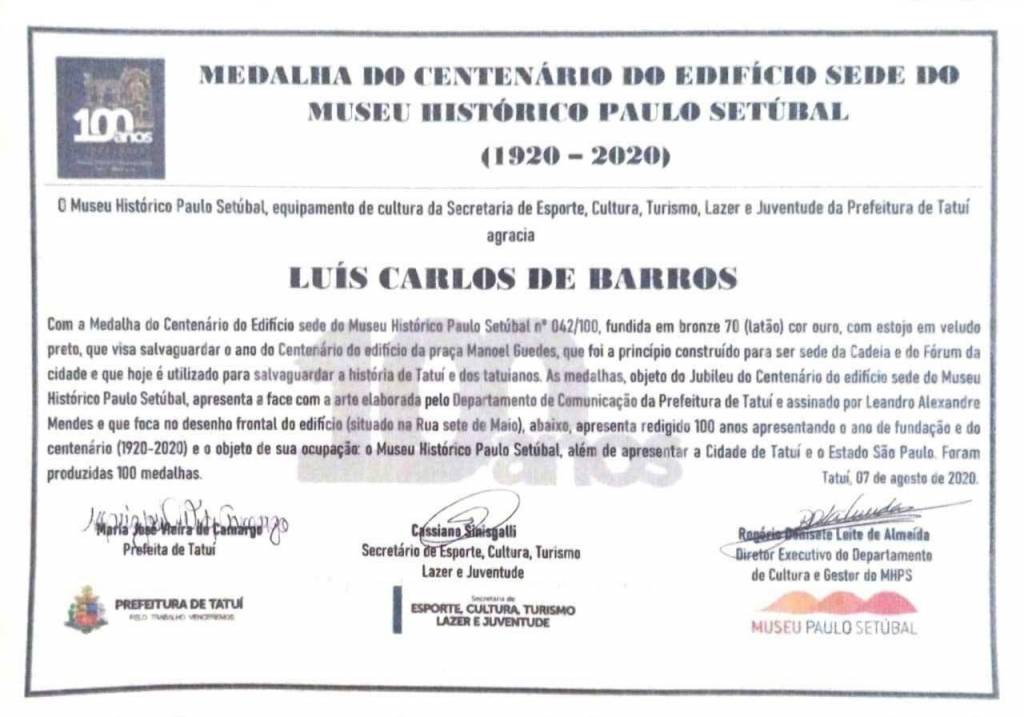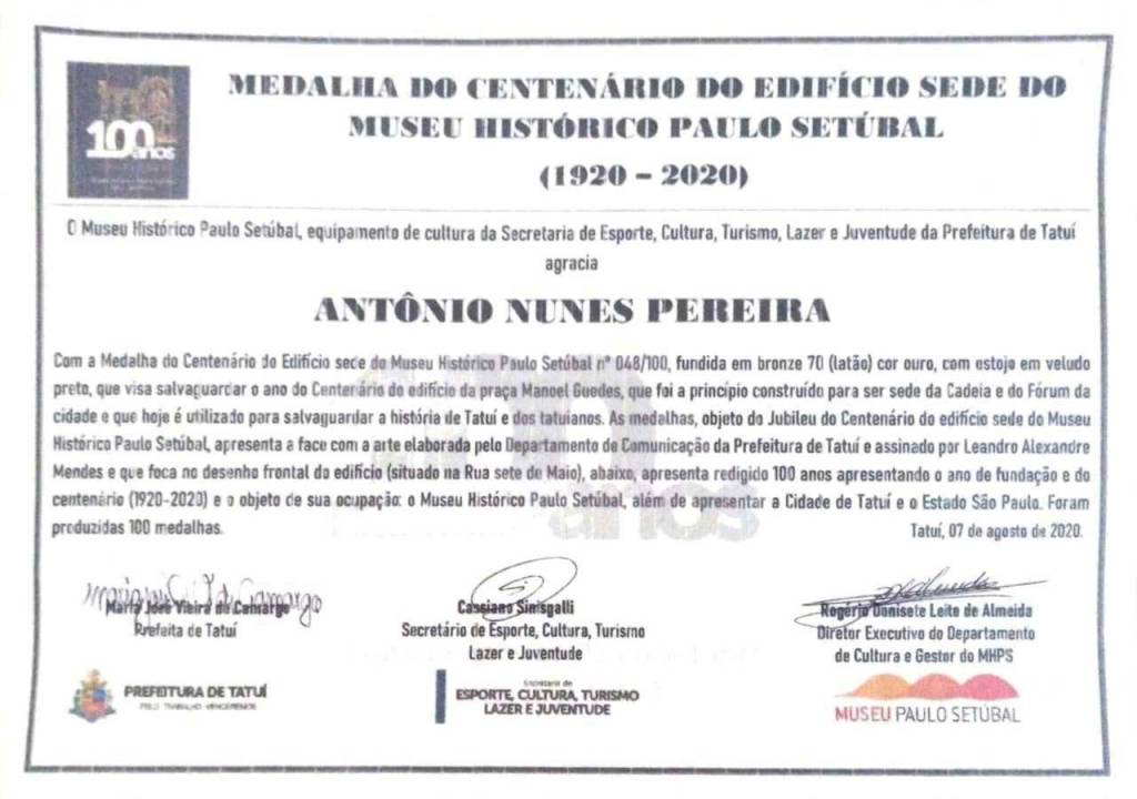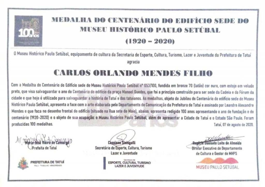 A distinção, para celebrar os cem anos do edifício, que hoje abriga o maior acervo histórico do município, foi outorgada pela Secretaria de Esporte, Cultura, Turismo, Lazer e Juventude de Tatuí para cem personalidades da cidade, entre representantes do executivo, do legislativo, de clubes de serviços, de associações e autoridades ligadas a fins culturais,.