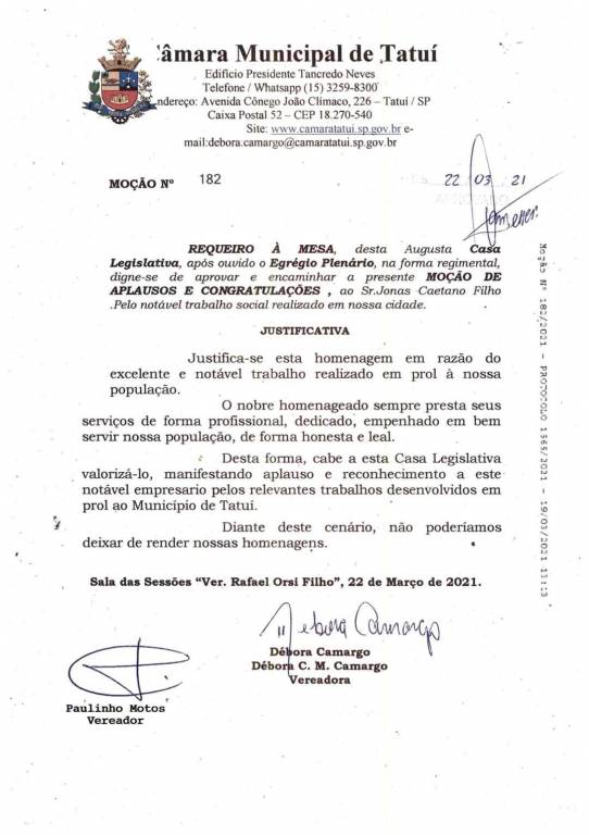A Câmara Municipal de Tatuí outorgou ao companheiro Jonas Caetano Filho a “Moção de Aplausos e Congratulações nº 182”, em 22 de março, em razão do excelente trabalho realizado pelo mesmo em prol da nossa população.