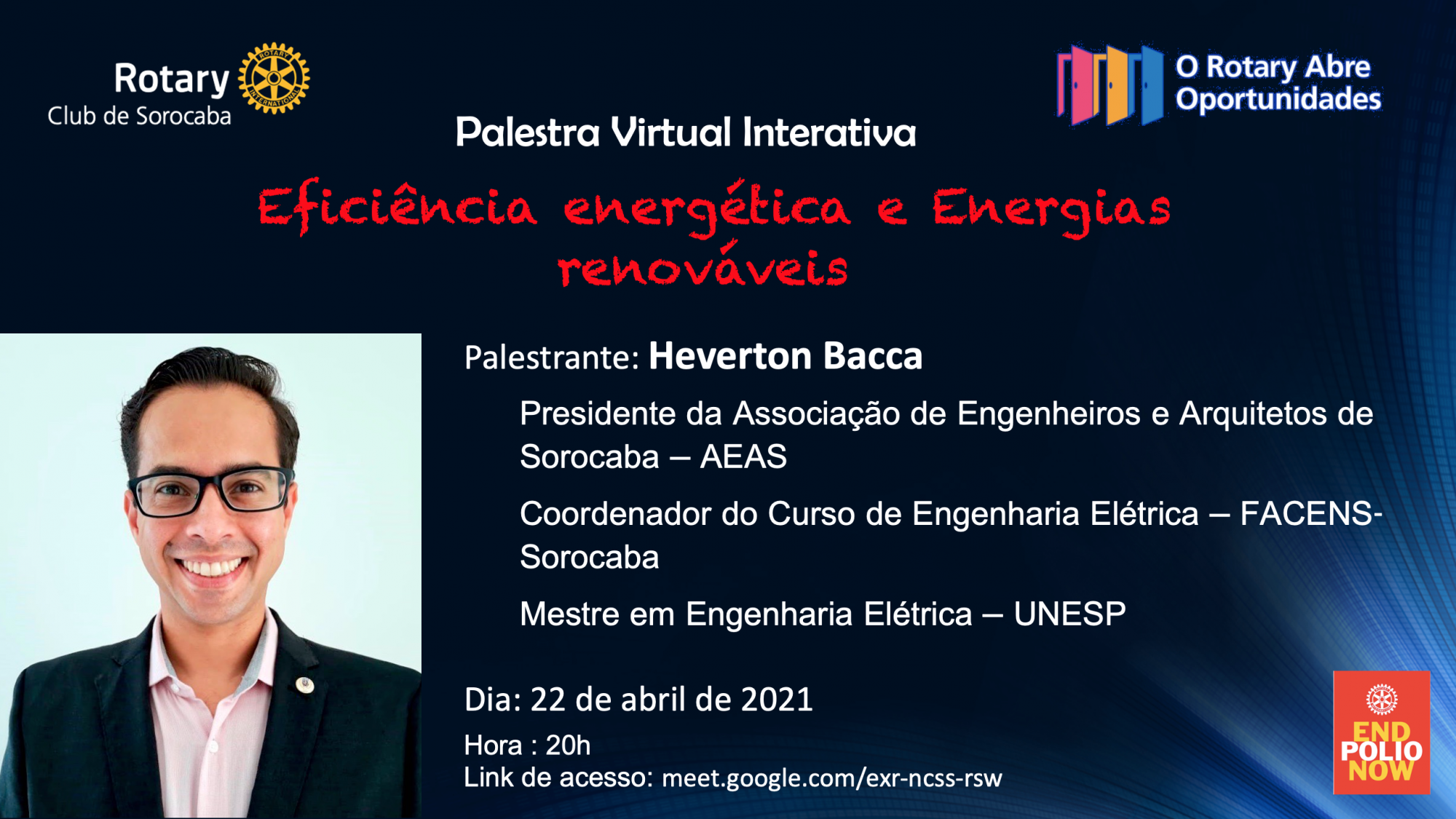 Ocorrerá dia 22/04/2021, quinta-feira, no Rotary Club de Sorocaba, a palestra intitulada:Eficiência Energética e Energias Renováveis, pelo Presidente da Associação de Engenheiros e Arquitetos de Sorocaba - AEAS, o Eng. Heverton Bacca.