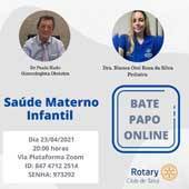 Na 21ª reunião ordinária online do Rotary Club de Tatuí, dia 23 de abril, Mês da Saúde Materno-Infantil no calendário rotário, também celebramos o nosso compromisso com o bem-estar de mães e filhos no mundo inteiro. O presidente Luís Barros, convidou os companheiros e médicos Paulo Kudo (ginecologista obstetra) e Bianca Orsi Rosa da Silva (pediatra), para apresentarem os seus conhecimentos, vivências e sugestões, nessa área.