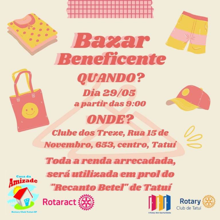 A Casa da Amizade (CA) e o Rotaract Club de Tatuí efetuaram, no sábado, dia 15, a entrega de produtos alimentícios à Associação Recanto Betel, de Tatuí. E realizarão um bazar no dia 29 de maio, a partir das 9h, no Clube dos 13 (Rua XV de Novembro, 653, Centro, Tatuí), em prol daquela entidade.