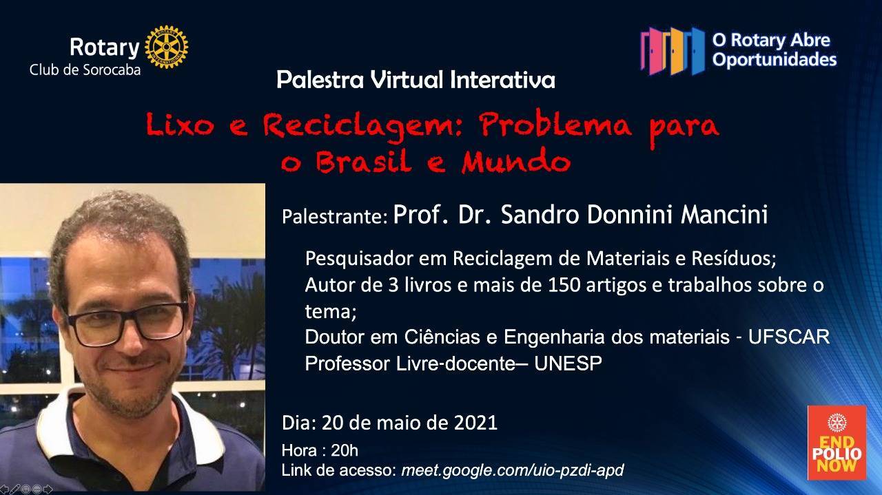 Ocorrerá dia 20/05/2021, quinta-feira, no Rotary Club de Sorocaba, a palestra intitulada: "Lixo e Reciclagem: Problema para o Brasil e Mundo". A palestra será proferida pelo Prof. Dr. Sandro Donnini Mancini, pesquisador em Reciclagem de Materiais e Resíduos, autor de 3 livros e mais de 150 artigos e trabalhos sobre o tema e Professor da UNESP Sorocaba.