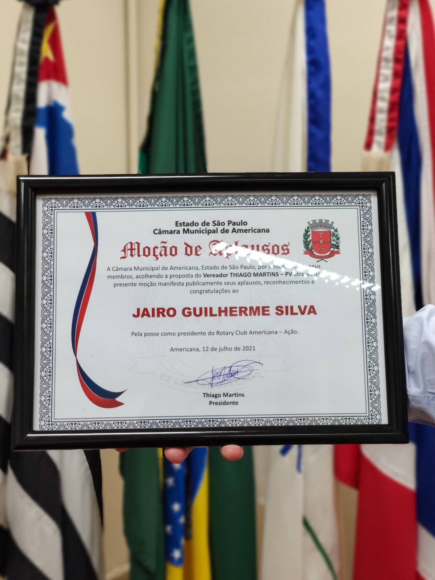 Encaminhamos a Vossa Senhoria a inclusa cópia da Moção de Aplausos ao Jairo Guilherme Silva pela posse como presidente do Rotary Club Americana - Ação.