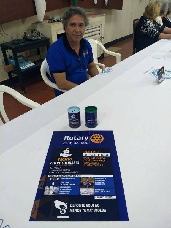A presidente Cima Ferriello solicitou que o presidente da Comissão de Projetos Humanitários, Antonio David Julian, apresentasse a campanha Cofre Solidário, cujo valor arrecadado será doado à Fundação Rotária. Após citar diversos benefícios que nosso clube realizou na cidade com recursos da Fundação, David fez a distribuição dos cofrinhos aos companheiros que poderão deixá-los em estabelecimentos comerciais, bancários ou mesmo com familiares. “Doe parte do seu troco. Com uma moeda, você contribui para ações humanitárias desenvolvidas pelo Rotary, no mundo todo”, explicou David.