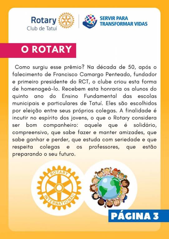 O tradicional prêmio “Francisco Camargo Penteado, o Melhor Companheiro”, pelo qual o Rotary Club de Tatuí contempla, anualmente, estudantes do quinto ano, foi realizado nos meses de novembro e dezembro. Houve, neste ano, 72 ganhadores, de 20escolas públicas e 6particulares, todos escolhidos pelos próprios colegas de sala. Veja abaixo a relação completa dos premiados.