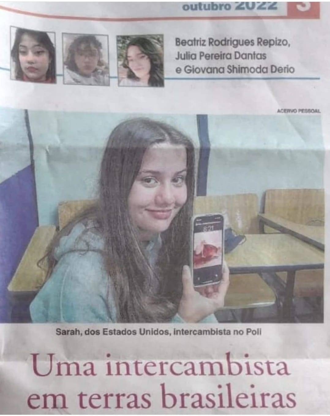 Sarah Marie Oliver, intercambista pelo Rotary International, ganhou espaço na Folha do Poli. Entrevistada, falou sobre a expectativa da viagem, a experiência que esta vivendo e muito mais. Super simpática, Sarah é a filha americana de Elsa Marísia Ferrari Paluan e Evandro Augusto da Silva, em Sorocaba-SP, país de Eduarda, intercambista pelo RC Sorocaba Novas Geracões.