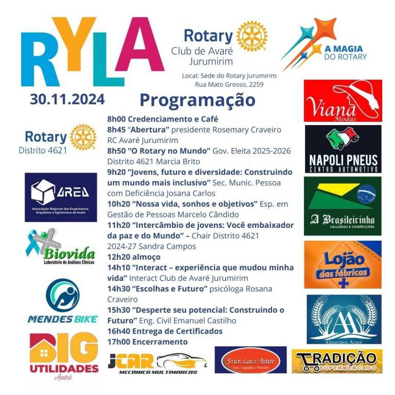 O sucesso do RYLA 2024 foi garantido pelo apoio de importantes patrocinadores: Laboratório Biovida, Jcar Mecânica, Mendes Bike, Viana Modas, AREA, Lojão das Fábricas, A Brasileirinha, Big Utilidades Avaré, Napoli Pneus, Frios Lac, Supermercado Tradição, Alimentos Avaré e Distrito 4621.
