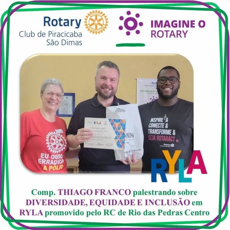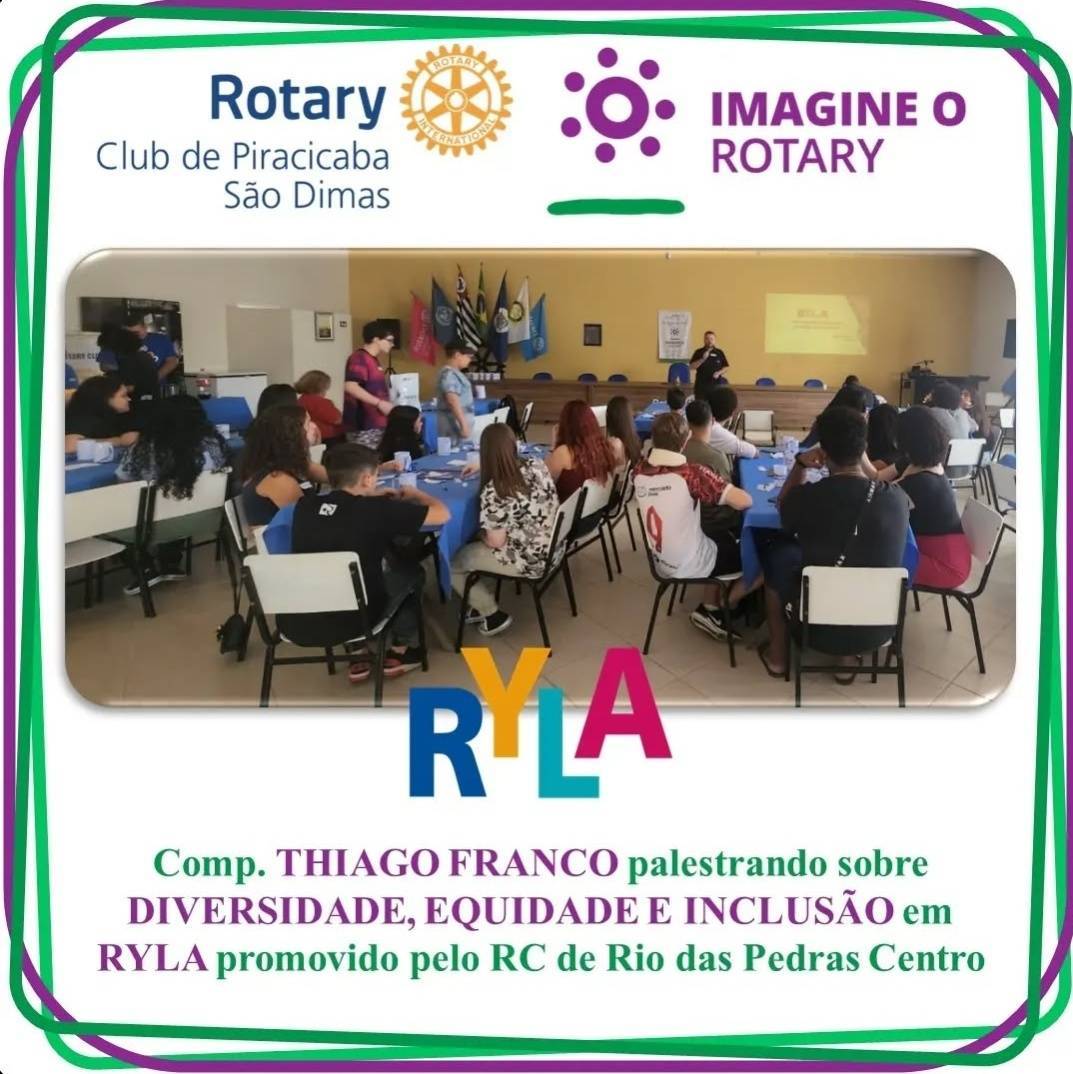 O Companheiro Thiago Franco, do Rotary Club de Piracicaba São Dimas, também presidente da Comissão de Diversidade, Equidade e Inclusão do Distrito 4621, abordou a temática Diversidade Humana durante RYLA promovido pelo Rotary Club de Rio das Pedras Centro. O evento ocorreu na AFRORP e contou com a presença de jovens e adultos profissionais da Educação.