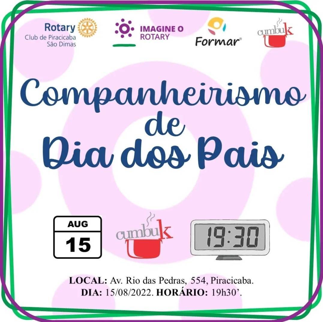 O Rotary Club de Piracicaba São Dimas, em reunião ordinára e festiva para Dia dos Pais se reuniu com amigos e familiares no restaurante Cumbuk, localizado em Piracicaba. Previamente conhecidas as instalações, uma noite agradável, de amizade e companheirismo se desenvolveu.