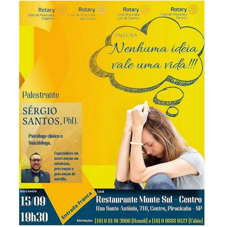 O Rotary Club de Piracicaba São Dimas, conjuntamente aos Rotary Clubs de Piracicaba Engenho, Piracicaba Luiz de Queiroz e Piracicaba Paulista, promoveram a palestra intitulada "Nenhuma idéia vale uma vida", proferida pelo Comp. Sérgio Santos, do Rotary Club Luiz de Queiroz. A palestra se consolidou na Valorização da Vida e Prevenção ao Suicídio, integrando ações do "Setembro Amarelo". Aberta ao público em geral, a reunião conjunta ocorreu no restaurante Monte Sul - Centro, em Piracicaba/SP.
