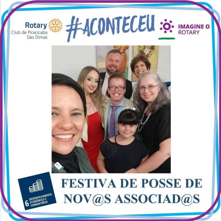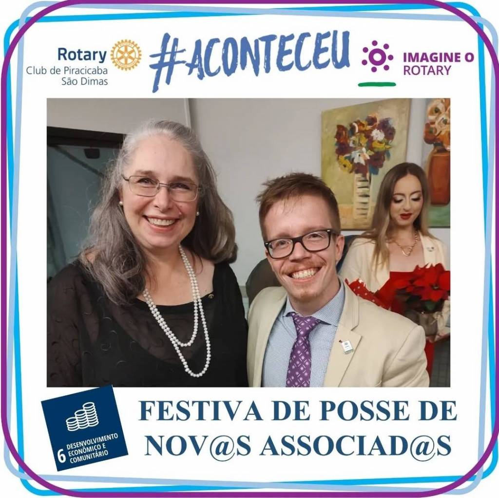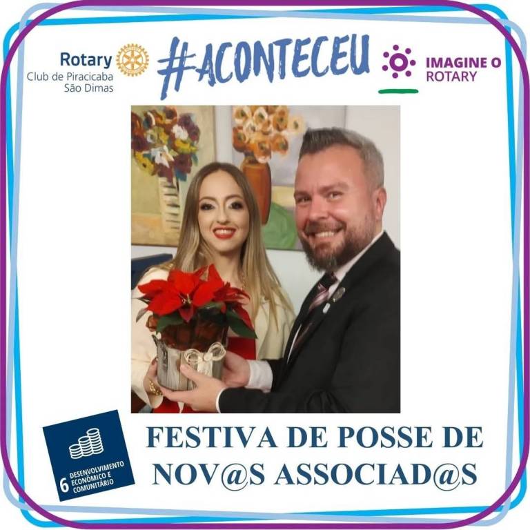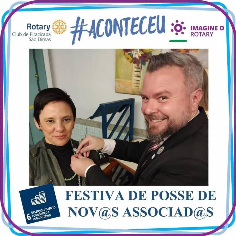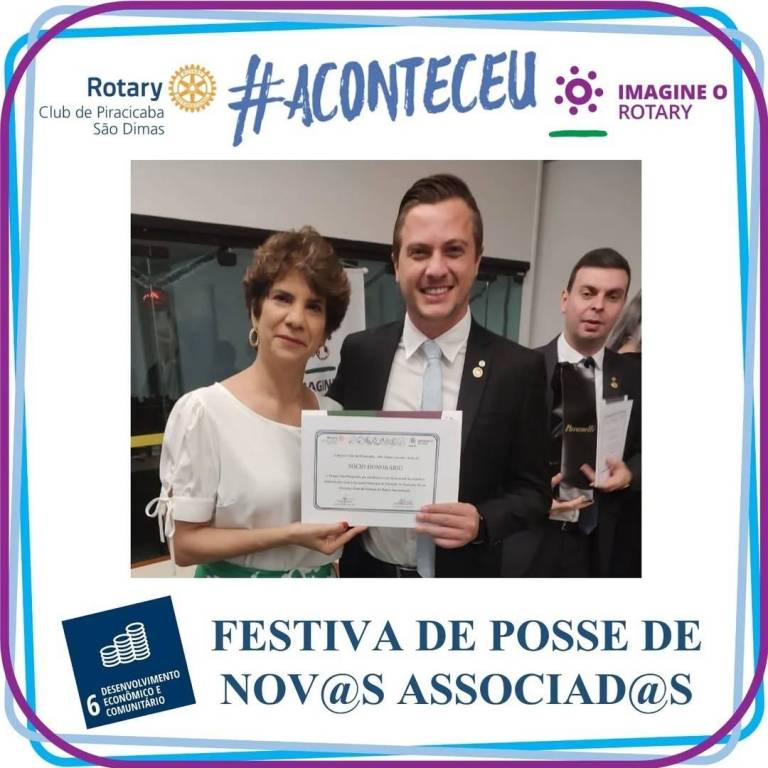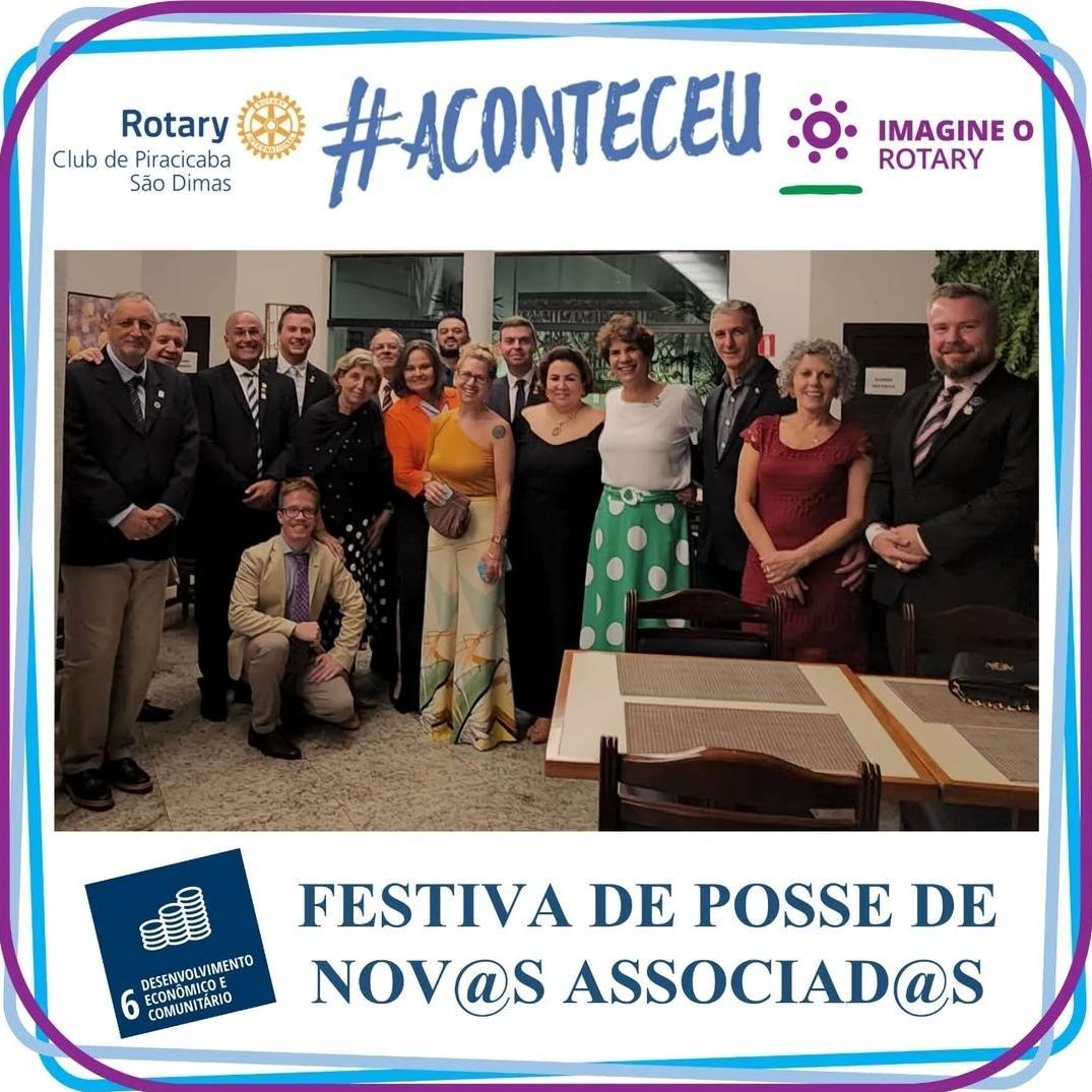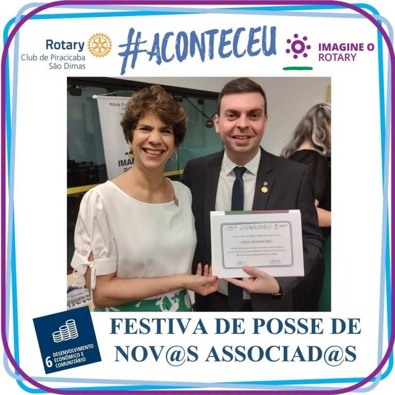 O Rotary Club de Piracicaba São Dimas deu posse a três novas associadas, as companheiras Giselle (padrinho Comp. Artur Janeiro), Amanda e Graziela (padrinho Comp. Thiago Franco). Ainda, os companheiros Thiago Marquezin e Bruno Roza, do Rotary Club de Araras Sul receberam o título de Sócios Honorários pela Presidente Comp.ª Laila Maria Simão. A ação contempla atividades previstas pelo Rotary Club de Piracicaba São Dimas que promovam a área de enfoque Desenvolvimento Econômico e Comunitário. A reunião ordinária e festiva contou com a presença de companheiros e companheiras do já citado Rotary Club de Araras Sul e também do Rotary Club de Saltinho. Imagine o Rotary! Imagine um mundo de conexões.