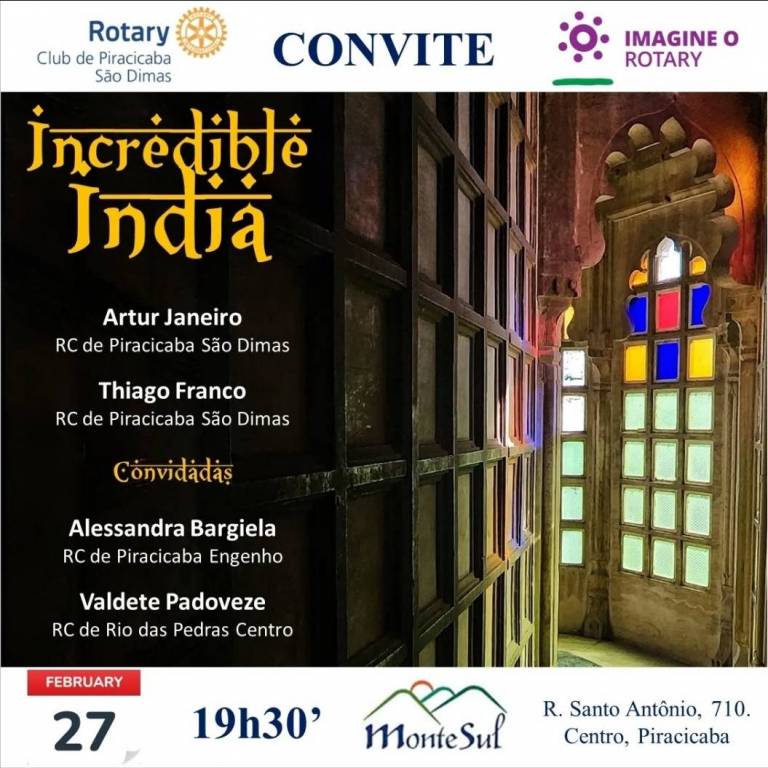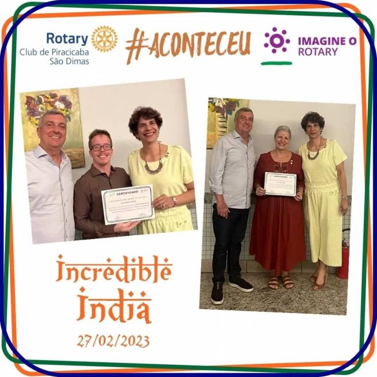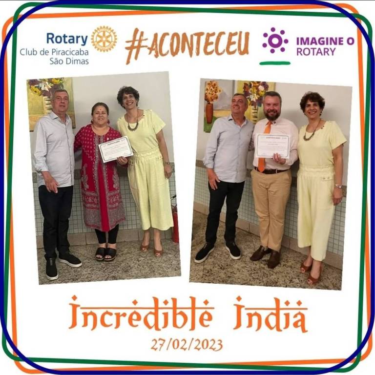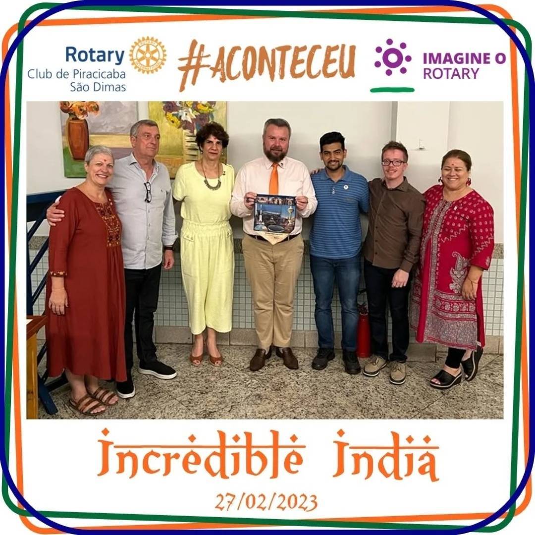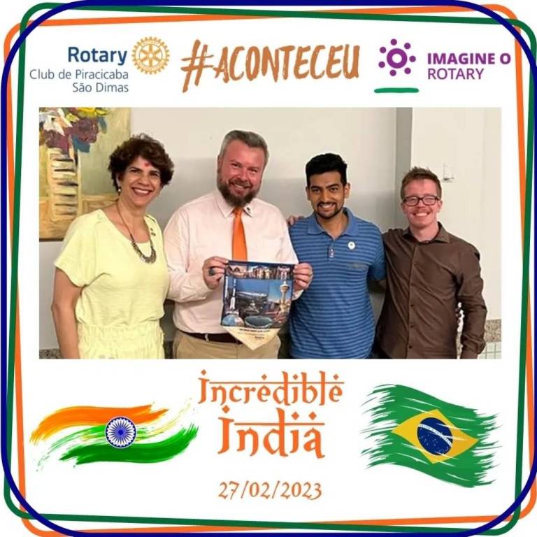 Os companheiros Artur Janeiro e Thiago Franco do Rotary Club de Piracicaba São Dimas juntamente com as Companheiras Alessandra Bargiela (Rotary Club de Piracicaba Engenho) e Valdete Padoveze (Rotary Club de Rio das Pedras Centro) participaram do Programa de Intecâmbio Cultural Incredible India, uma experiência para rotarianos e rotarianas do mundo todo. Na ocasião da reunião ordinária do Rotary Club de Piracicaba São Dimas, as companheiras foram convidadas a compartilhar conjuntamente as experiencias marcantes decorrentes do intercâmbio. Assim, aberta a toda comunidade, rotarianos e rotarianas de outros clubes, familiares e visitantes defrutaram da replicabilidade de nossos companheiros, seguido de jantar no restaurante Monte Sul (Piracicaba/SP). Destaca-se a presença do Governador e Coordenadora eleitos (2023-2024), Roberto Roberti e Enedir, além do intercambista Umang Shah (também da Índia). Imagine o Rotary! Imagine uma só nação!