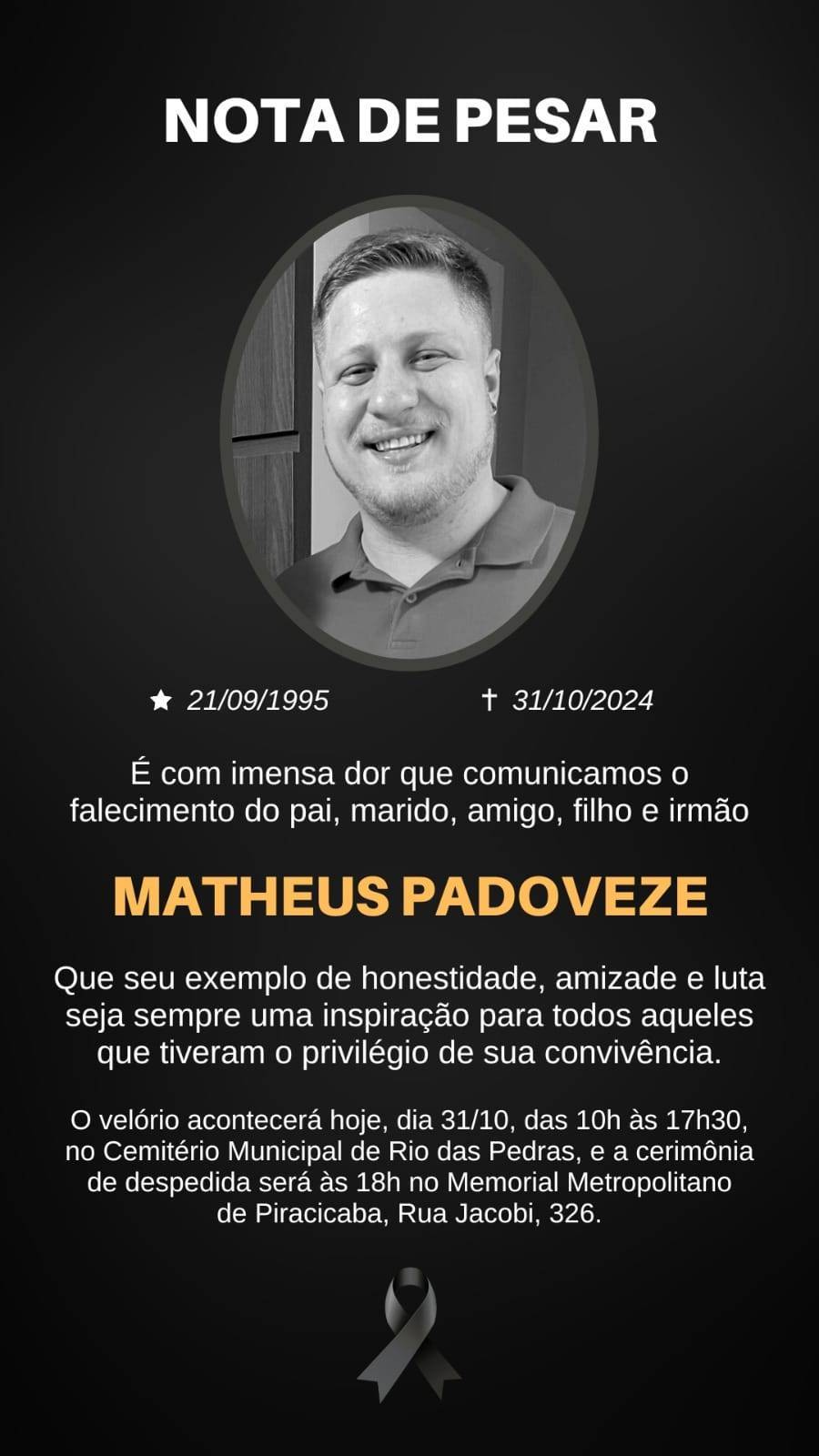 É com imensa tristeza que nos despedimos de Matheus Felipe Padoveze, sócio fundador do Rotaract Club de Rio das Pedras. Sua dedicação e alegria deixaram uma marca especial na Família Rotaract Brasil. Estamos em luto e unidos à sua família neste momento difícil. Que sua memória siga viva em nossos corações