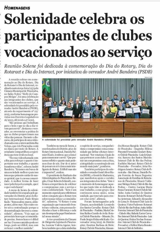 Em uma comunidade com muito serviço, essa é a hora de festejar, seguindo o lema, "sonhar, produzir e celebrar", assim comemora-se as atividades dos Rotary Club e suas divisões com jovens Rotaract Club e Interact club, sempre muito motivados no servir. Esse ano, a prefeitura de Piracicaba teve em um dos seus homenagiados o nosso companheiro Leonardo Carvalho, presidente 2023-2024 e atual diretor de secretaria. Parabens companheiro, continuamos na luta de um mundo mais gentil, humanitario e solidario!