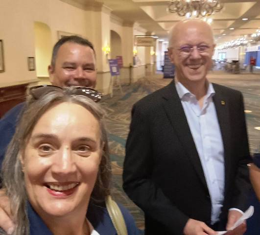 O Casal Governadoria 2025-2026 do Distrito 4621 Marcia Brito e Neto Acacio, associados do RC de Avaré Jurumirim com Presidente de Rotary International Mário Cesar de Camargo, durante a assembléia Internacional realizada em Orlando.