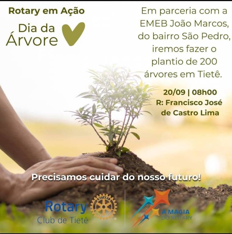 O Plantio de árvores ocorreu no dia 20 de setembro de 2024, com 66 alunos da escola EMEB Joao Marcos Baptista Marcuz. Os alunos muito interessados nas questoes do meio ambiente, onde fizeram muitas perguntas para o palestrante e Secretário do Meio Ambiente e Agricultura - Rodrigo Modúlo. Este Projeto realizado em parcerias com: Rotary Club de Tiete, Secretaria de Educaçao, Escola EMEB Joao Marcos Baptista Marcuz e Secretária de Segurança e Transito do municipio de Tiete. Foram plantadas árvores de flores e frutos para atrair, passaros, borboletas e insetos. Além de embelezar a cidade e dar a delciosa sombra. Foi um orgulho este projeto.