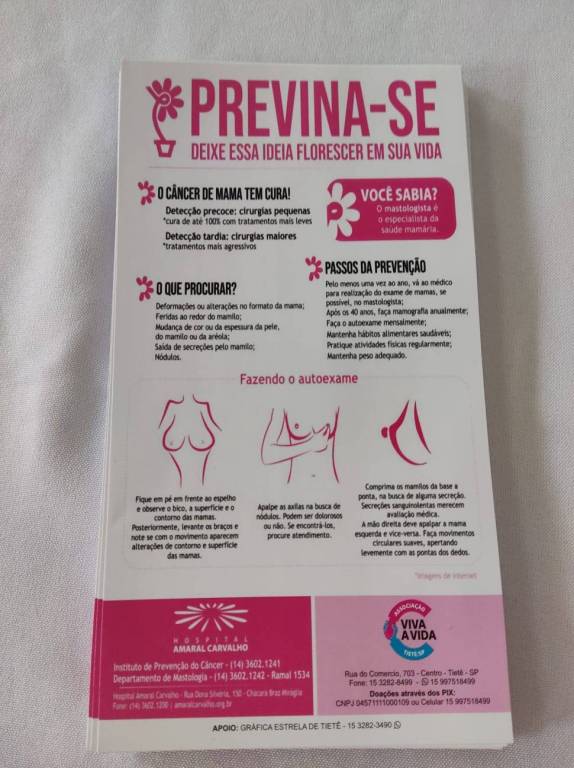 Contamos com o apoio, panfletos e camisetas especiais para a data, da Associaçao Viva a Vida, Liga do Cancer em Tiete. As Informaçoes de muita relevancia e direcionamento para a pessoa e para familiares. Muito acolhimento. Foi explicado com as pessoas devem se cuidar e se direcionar para um tratamento o mais breve possível. Muito impactante.