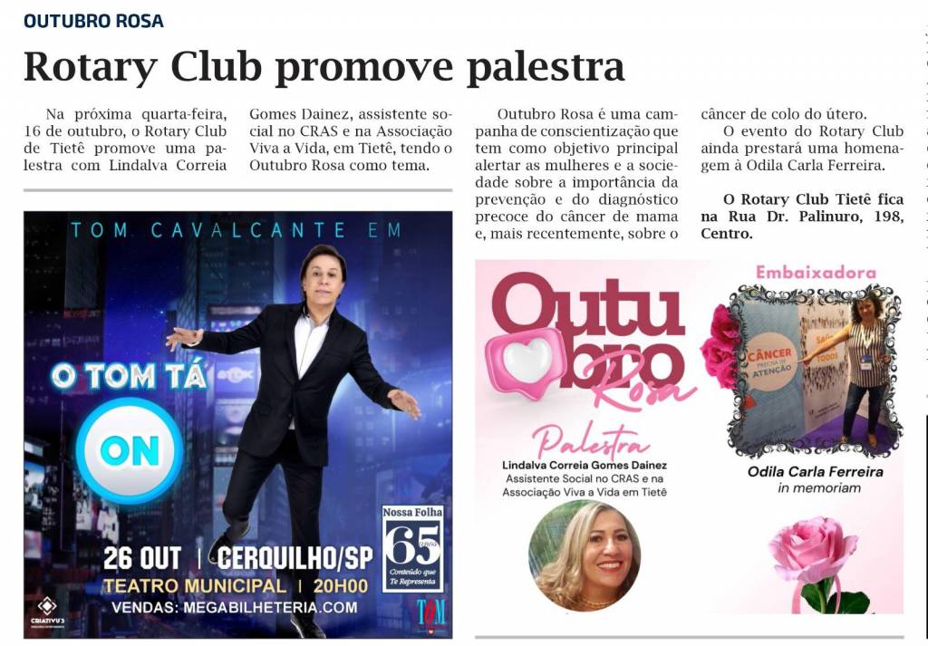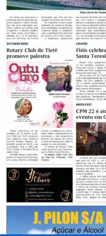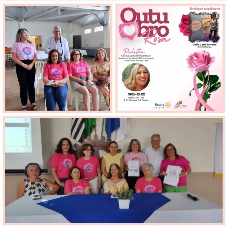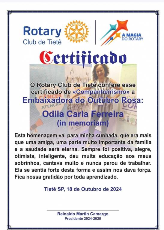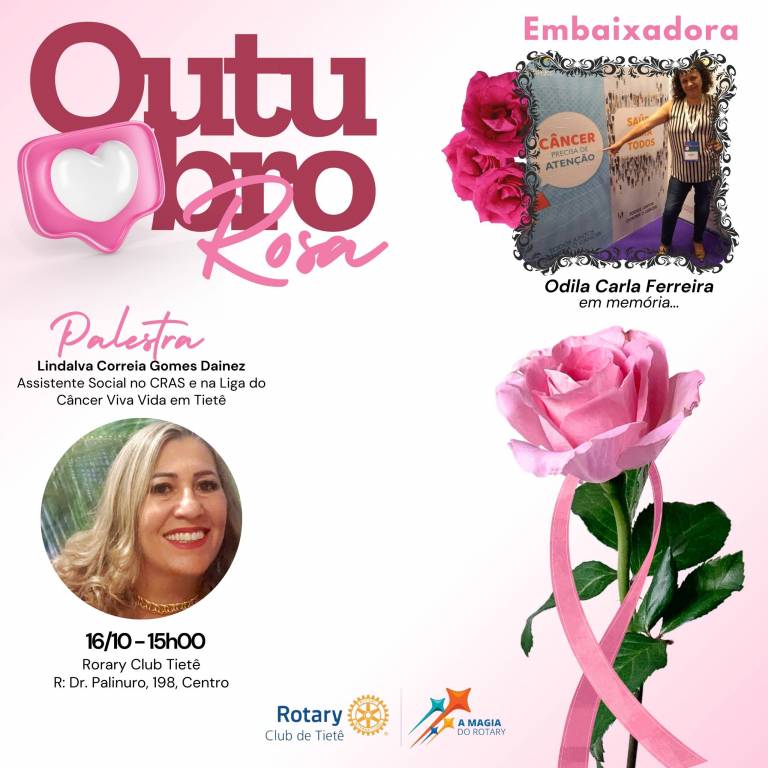 O Rotary Club de Tiete teve a honra de realizar "Outubro Rosa", homenageando a embaixadora Odila Carla Ferreira, que durante 4 anos combateu e acreditou na sua cura, pela sua luta, seu exemplo de resistencia, mesmo com muita dor, sorria e nos dava força, trabalhava sem desistir. Seu exemplo ficará para sempre em nossos coraçoes.