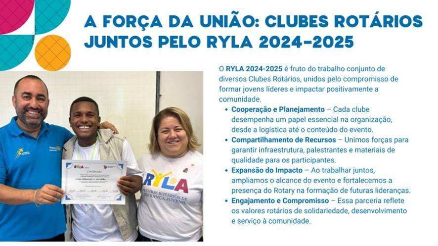 Organizado em conjunto por seis Rotary Club (Piracicaba, Engenho, Mirante, Paulista, Povoador, Botucatu-Norte) unidos pelo compromisso com a juventude, o RYLA (Rotary Youth Leadership Awards) é um programa gratuito e imersivo que desenvolve habilidades essenciais para jovens líderes que desejam causar impacto positivo em suas comunidades.
