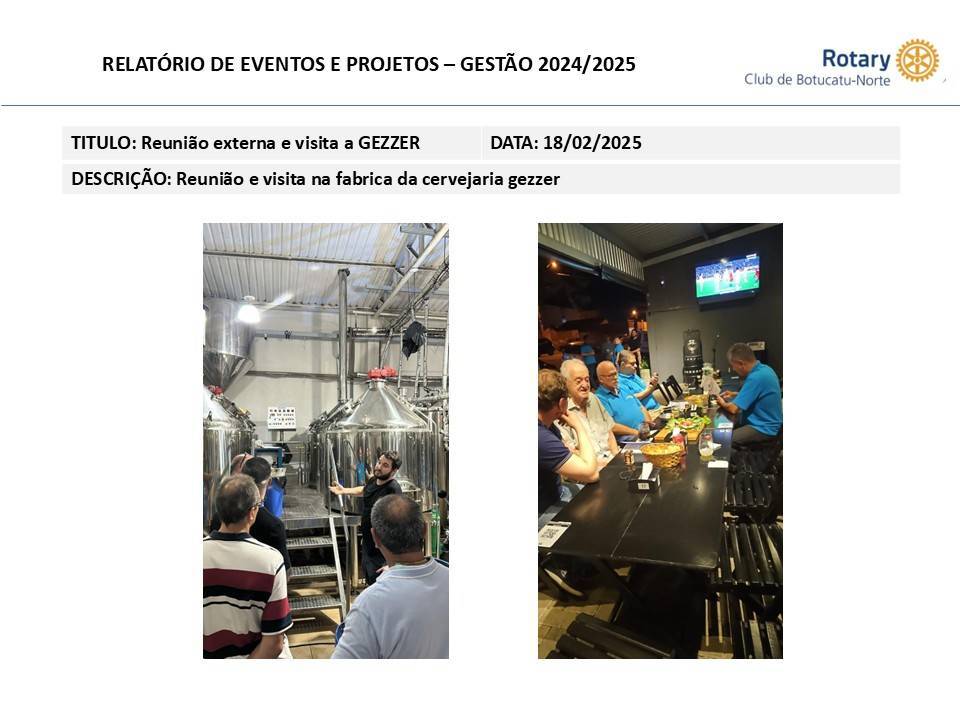 No compromisso contínuo do Rotary com o fomento ao empreendedorismo e à valorização de empresas inovadoras em nossa região, realizamos uma enriquecedora visita técnica à fábrica da Cervejaria Gezzer. O encontro promovido proporcionou aos membros do clube uma imersão no universo do processo produtivo cervejeiro e no dia a dia de um empreendimento de destaque nacional.