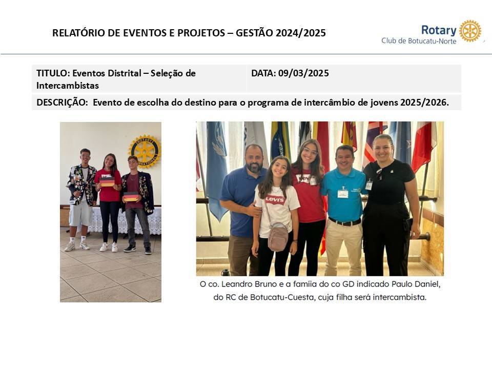 No último dia 9 de março, o Rotary Club de Sorocaba foi palco de um momento emocionante: a reunião de escolha dos destinos para o Programa de Intercâmbio de Jovens 2025/2026, sendo Maria Eduarda Delazari Leite, indicada do RC Botucatu - Norte, comtemplada com a 3ª vaga.