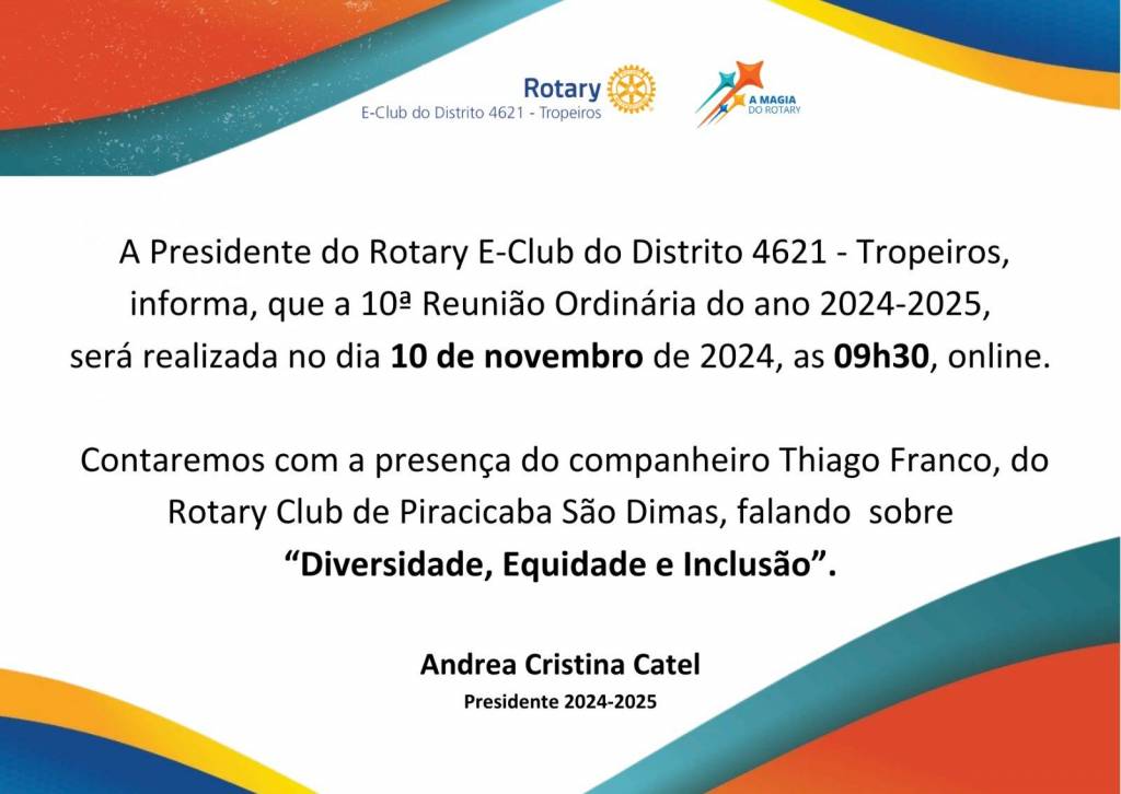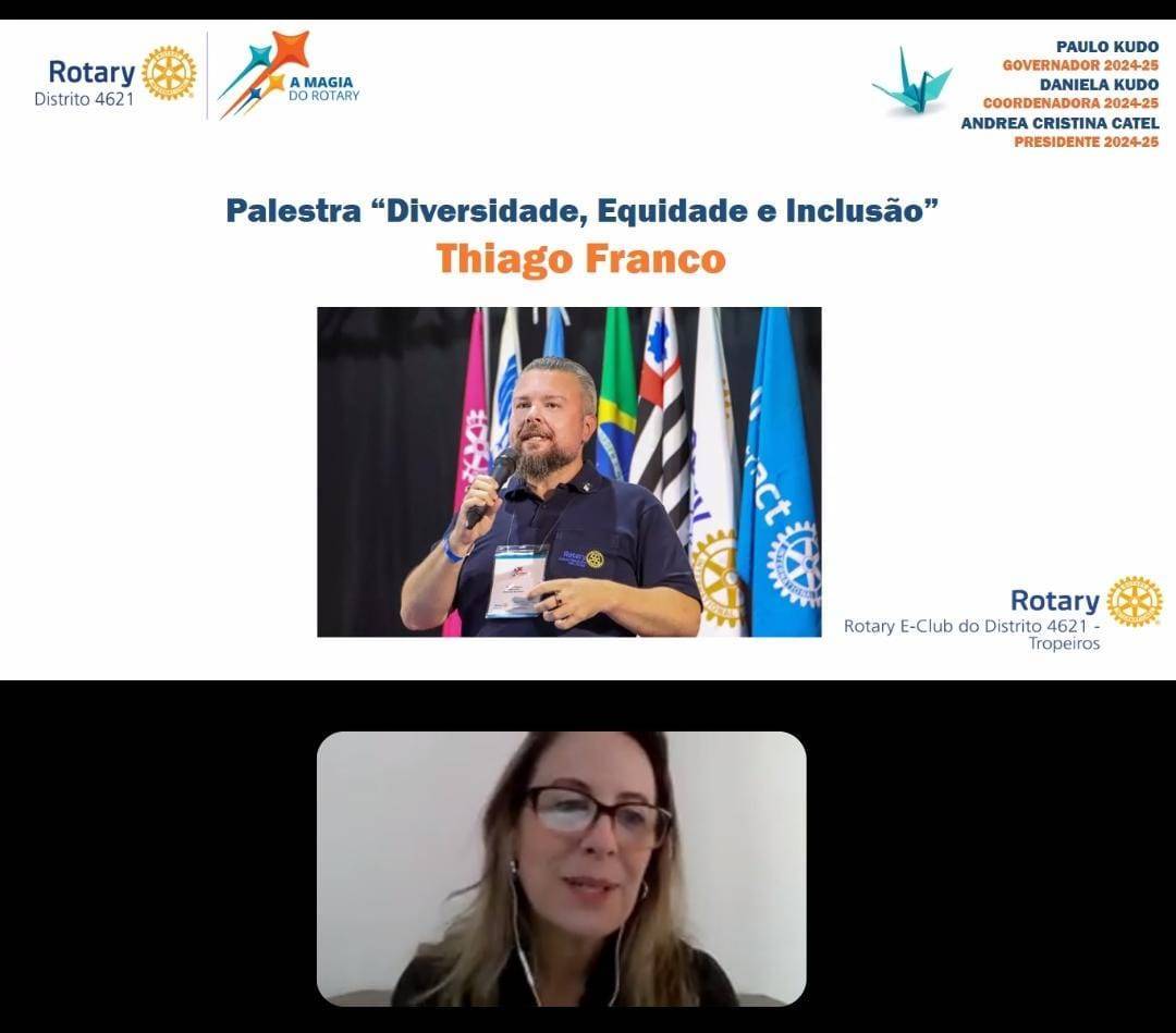 Formação/capacitação de rotarianas e rotarianos em Diversidade, Equidade e Inclusão ofertada pelo companheiro Thiago Franco do RC de Piracicaba São Dimas e Presidente da CDEI do Distrito 4621, à convite da Compa Presidente 2024-2025 Andrea Cristina Catel.