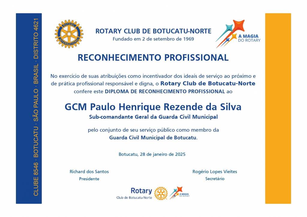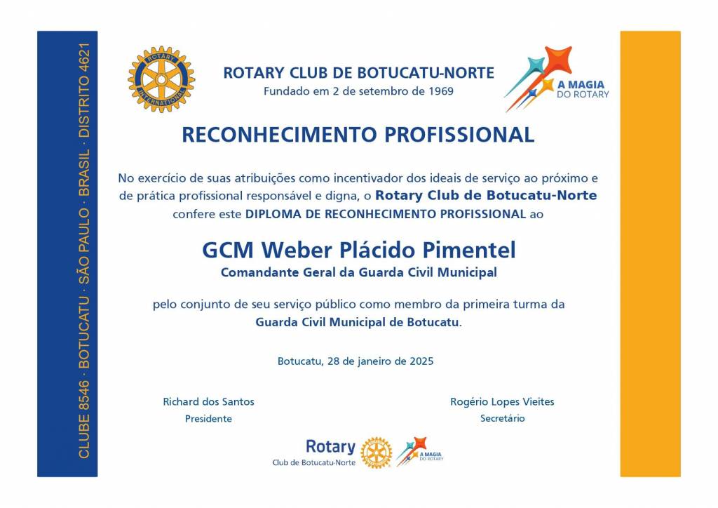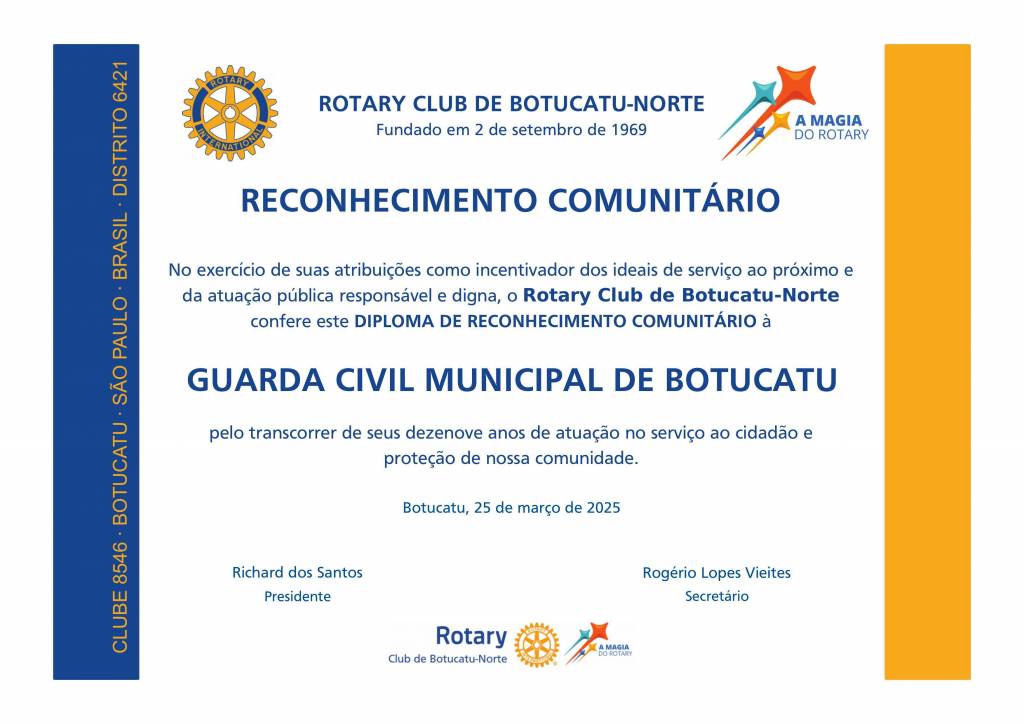 No auge da solenidade, o Rotary Club de Botucatu-Norte concedeu o Diploma de Reconhecimento Comunitário à Guarda Civil Municipal de Botucatu, enaltecendo seus dezenove anos de dedicação ininterrupta à proteção do cidadão e promoção do bem-estar coletivo. A homenagem é um reflexo do respeito e da gratidão da comunidade por homens e mulheres que, com coragem e responsabilidade, constroem diariamente um ambiente mais seguro para todos.