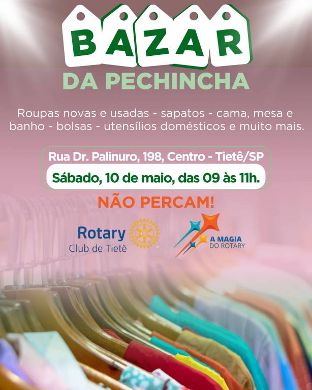 Rotary Club de Tietê realiza Bazar Beneficente no dia 10 de maio O Rotary Club de Tietê promove no próximo dia 10 de maio de 2025 (sábado), das 9h às 11h, um Bazar Beneficente com produtos variados a preços simbólicos. A ação acontecerá na sede do clube, localizada na Rua Palinuro, 198 – Centro, Tietê. A iniciativa tem como objetivo atender toda a comunidade, especialmente as famílias em situação de vulnerabilidade social, oferecendo itens de qualidade com valores acessíveis. A arrecadação será revertida para os projetos sociais mantidos pelo Club no município. Organizado por voluntários, o bazar é mais uma das ações que refletem o lema rotário “Dar de si, sem pensar em si”, reforçando o compromisso do Rotary com o serviço ao próximo. “Mais se beneficia quem melhor serve” é outra máxima que orienta o trabalho da instituição, que há décadas contribui com o desenvolvimento social e humano da cidade. “O Rotary está presente nas causas que realmente importam para a nossa comunidade. Esse bazar é uma forma de unir solidariedade e ação prática, ajudando quem mais precisa com dignidade e respeito”. O Rotary Club de Tietê convida toda a população a participar, contribuir e fazer parte dessa rede de solidariedade que transforma vidas.