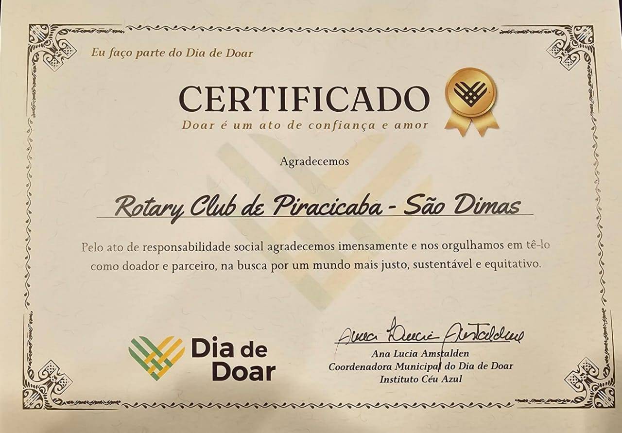 O RC de Piracicaba São Dimas esteve presente através dos Companheiros Paulo Spolidoro, Thiago Franco e Presidente Artur Janeiro para entrega de certificada de reconhecimento ao RC de Piracicaba São Dimas pelo apoio ao "Dia de Doar" - uma ação para promoção de mundo mais justo, sustentável e equitativo