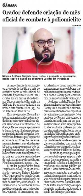 INTRODUÇÃO AO PROJETO DE LEI PARA O MÊS DA POLIO A SER APRESENTADO AO MUNICIPIO COM DIVULGAÇÃO EM MIDIA ATINGINDO CERCA DE 300MIL PESSOAS NO MUNICIPIO DE PIRACICABA - SP
