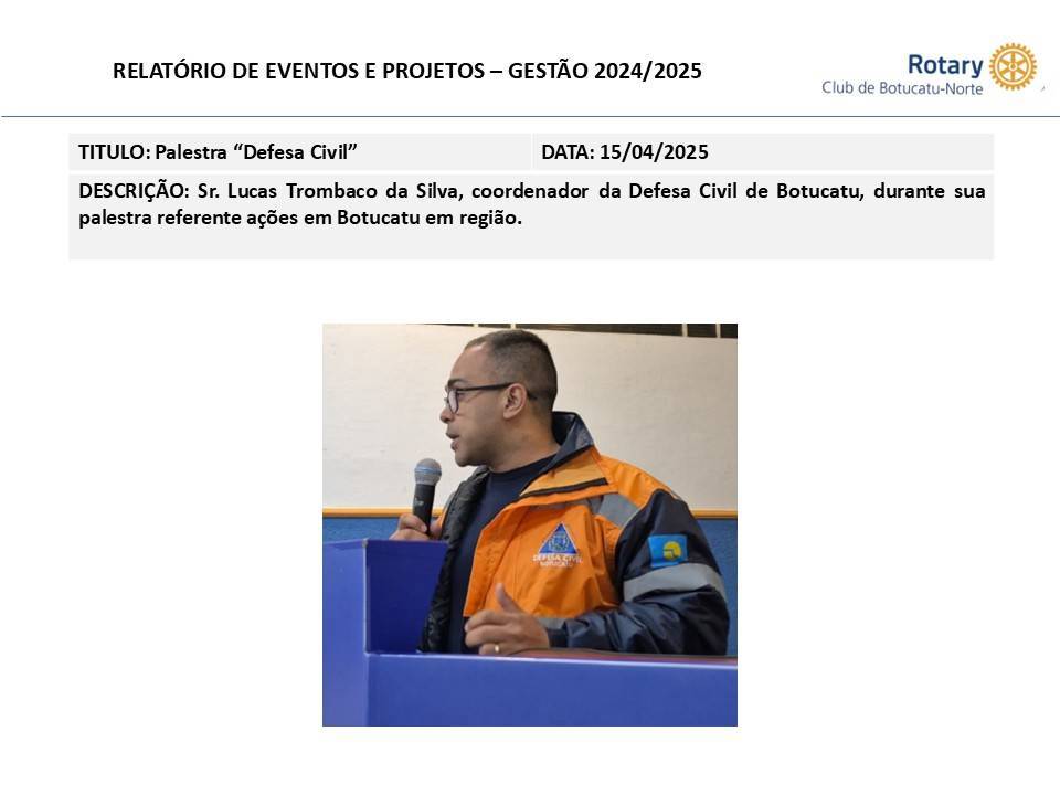 Sr. Lucas Trombaco da Silva, coordenador da Defesa Civil de Botucatu, realizou palestra referente ações em Botucatu em região.