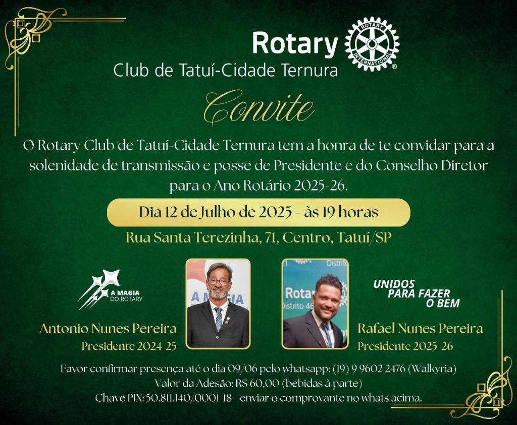 No último sábado, 12 de julho de 2025, o Rotary Club de Tatuí marcou presença na posse do novo presidente do Rotary Club de Tatuí Cidade Ternura, Rafael Nunes Pereira, para o ano rotário 2025-2026.