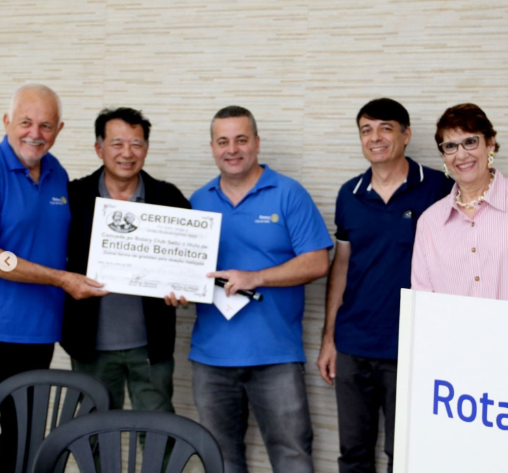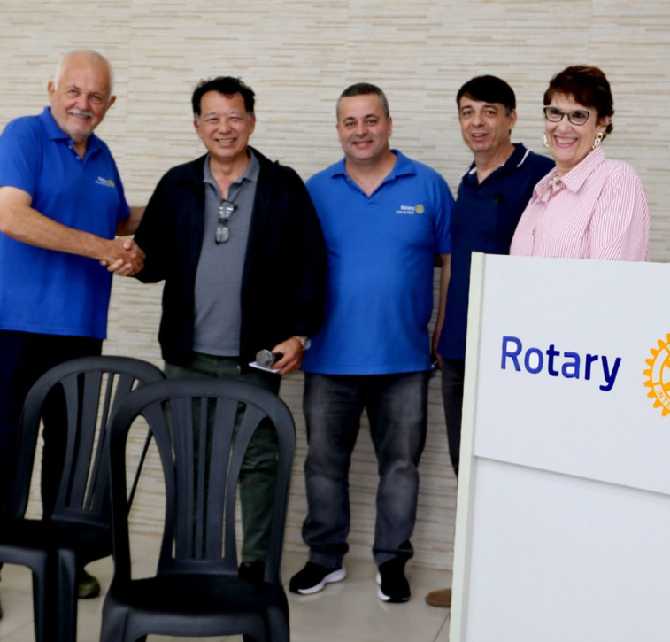 Na foto o Presidente Minoru, juntamente dos diretores, Marcos Magali recebem as doações das mãos do Past president Marcos Martins e e de Leandro Barbosa, presidente do Rotary na gestão última ação da gestão 2024-25 e conjunto com 2025-26.