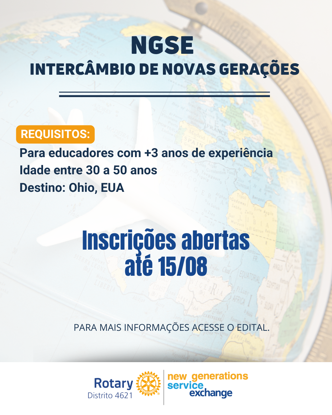 Estão abertas as inscrições para o NGSE - Intercâmbio de Novas Gerações - do Distrito 4621 em parceria com o Distrito 6690 (Ohio - EUA).