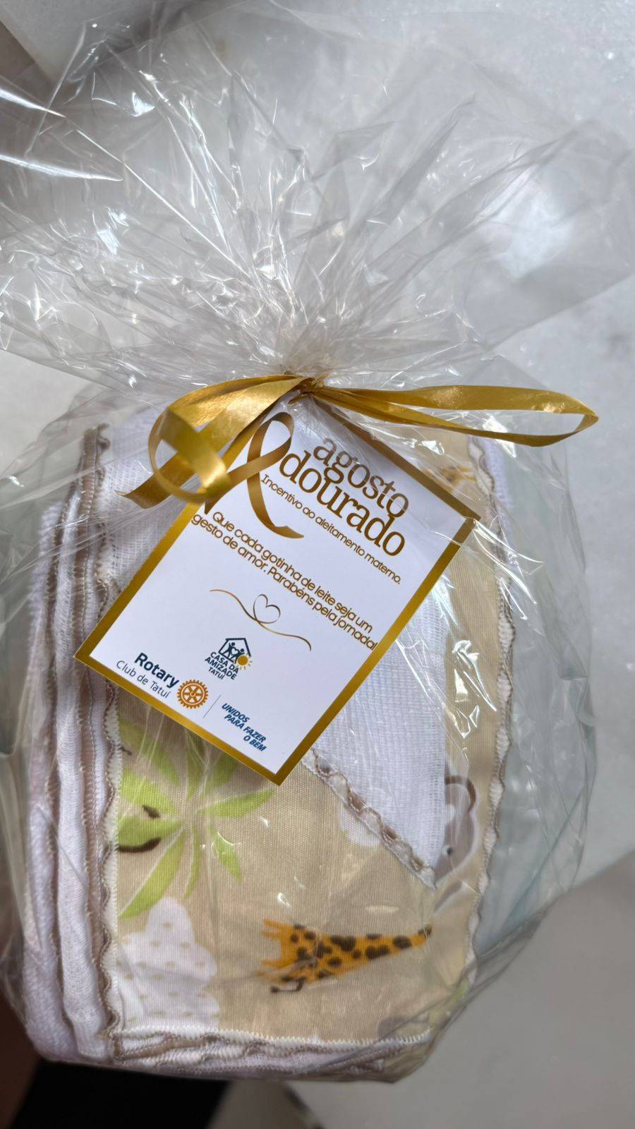Cada gestante ou mamãe em fase de amamentação recebeu uma lembrancinha especial (kit toalha de boca e ombro e um pacote de toalhinhas umedecidas).