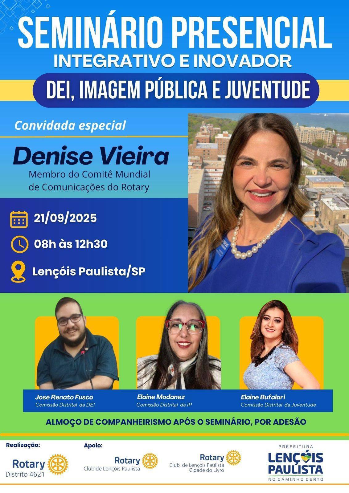 Com a participação super especial de Denise Vieira, um ícone da comunicação em Rotary, este encontro será uma oportunidade valiosa para refletirmos sobre os desafios e as possibilidades da construção de um Rotary mais inclusivo, participativo e dinâmico! Vamos dialogar sobre diversos temas e a unidade entre eles na busca por uma sociedade mais justa e plural.