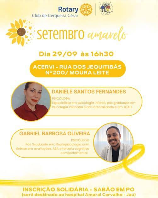 Em comemoração ao mês dedicado a prevenção do suicídio, Setembro Amarelo, o Rotary Club de Cerqueira César em parceria com a ACERVI, realizará no dia 29/9/2025, às 16h30, na sede da ACERVI palestra com os psicólogos, Daniele Santos Fernandes e Gabriel Barbosa Oliveira. Inscrição solidária: doação de sabão em pó, que serão destinados ao hospital Amaral Carvalho de Jaú.