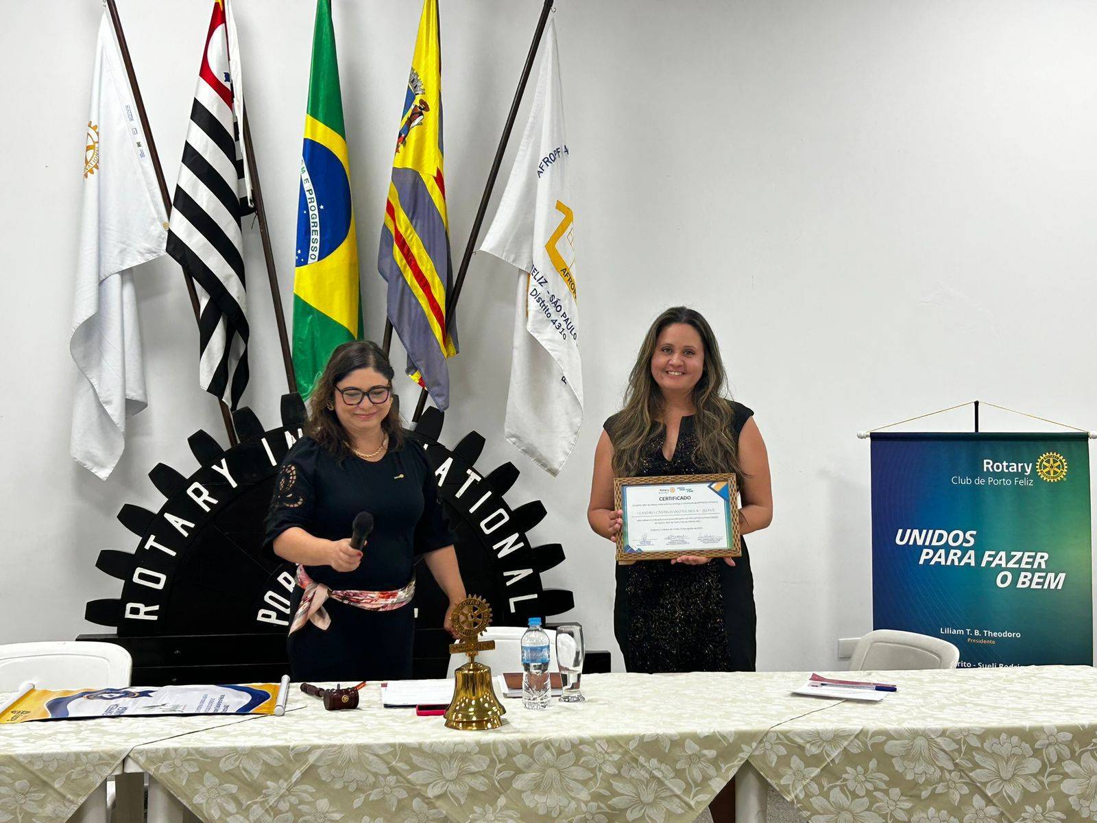 A homenagem foi entregue à companheira Verônica Castellano, representante da Jeleve, que tem se destacado pelo comprometimento com causas voltadas ao bem-estar da comunidade, responsabilidade social e incentivo à promoção da saúde, valores que se alinham diretamente com os princípios rotários.