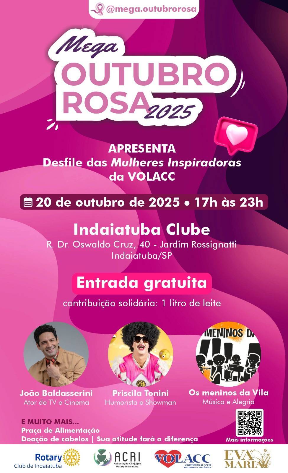 🎀 Save the Date – Mega Outubro Rosa 2025 🎀 Data: 20 de outubro de 2025 Horário: das 17h às 23h Local: Indaiatuba Clube – R. Dr. Oswaldo Cruz, 40 – Jardim Rossignatti, Indaiatuba/SP Entrada gratuita com contribuição solidária de 1 litro de leite