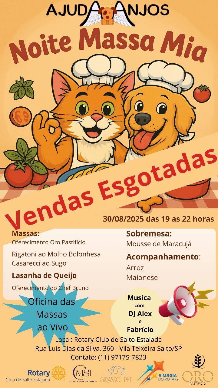SALTO (SP) — No dia 30 de agosto de 2025, o Rotary Club de Salto Estaiada promoveu o jantar beneficente “Noite Massa Mia – Ajuda Anjos”, com renda revertida para apoiar as atividades da ONG Ajuda Anjos, dedicada à causa animal.