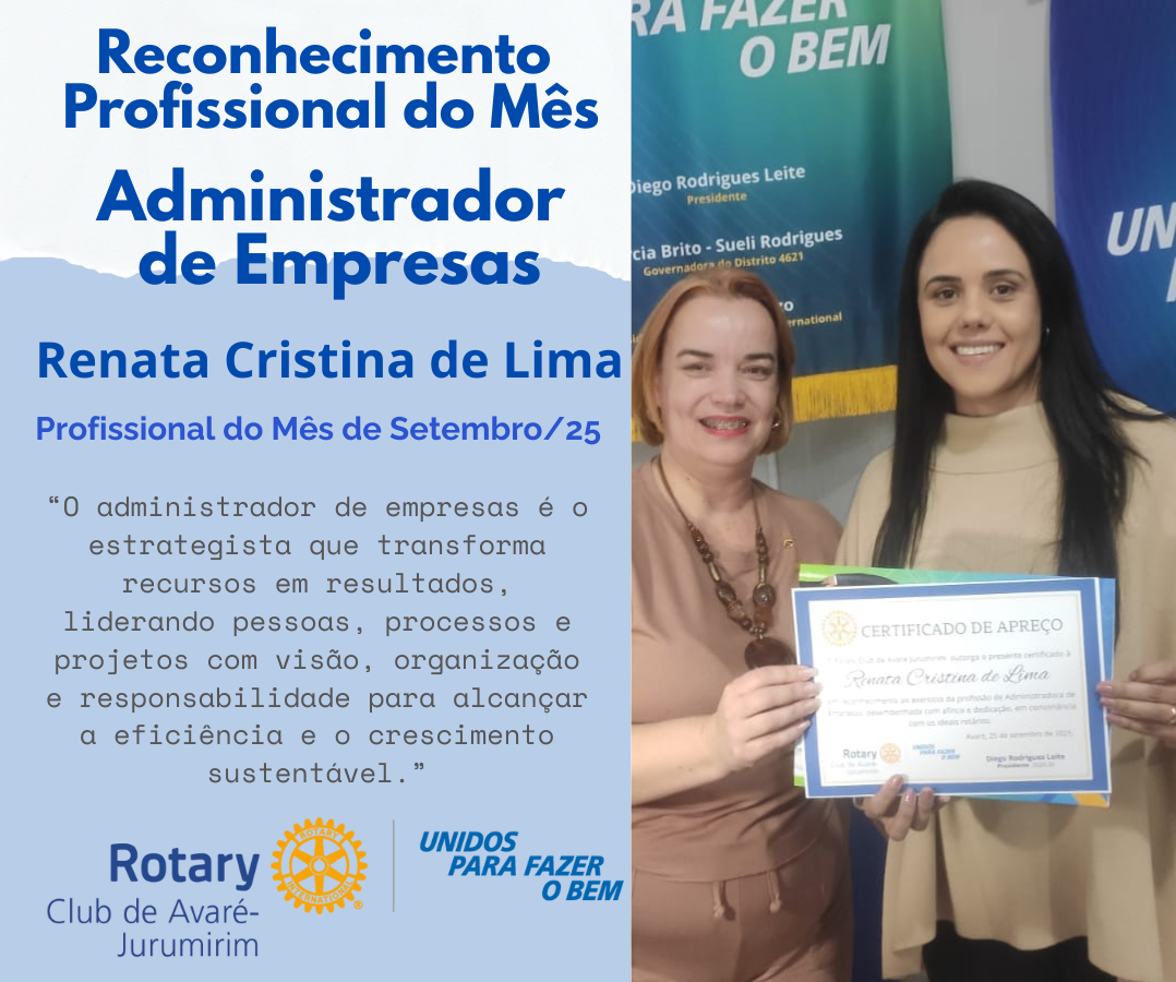 Através dessa singela homenagem o Rotary Club de Avaré Jurumirim cumprimenta a todos administradores de empresa que desenvolvem um papel crucial para transformar recuros em resultados. Parabéns a toda categoria.