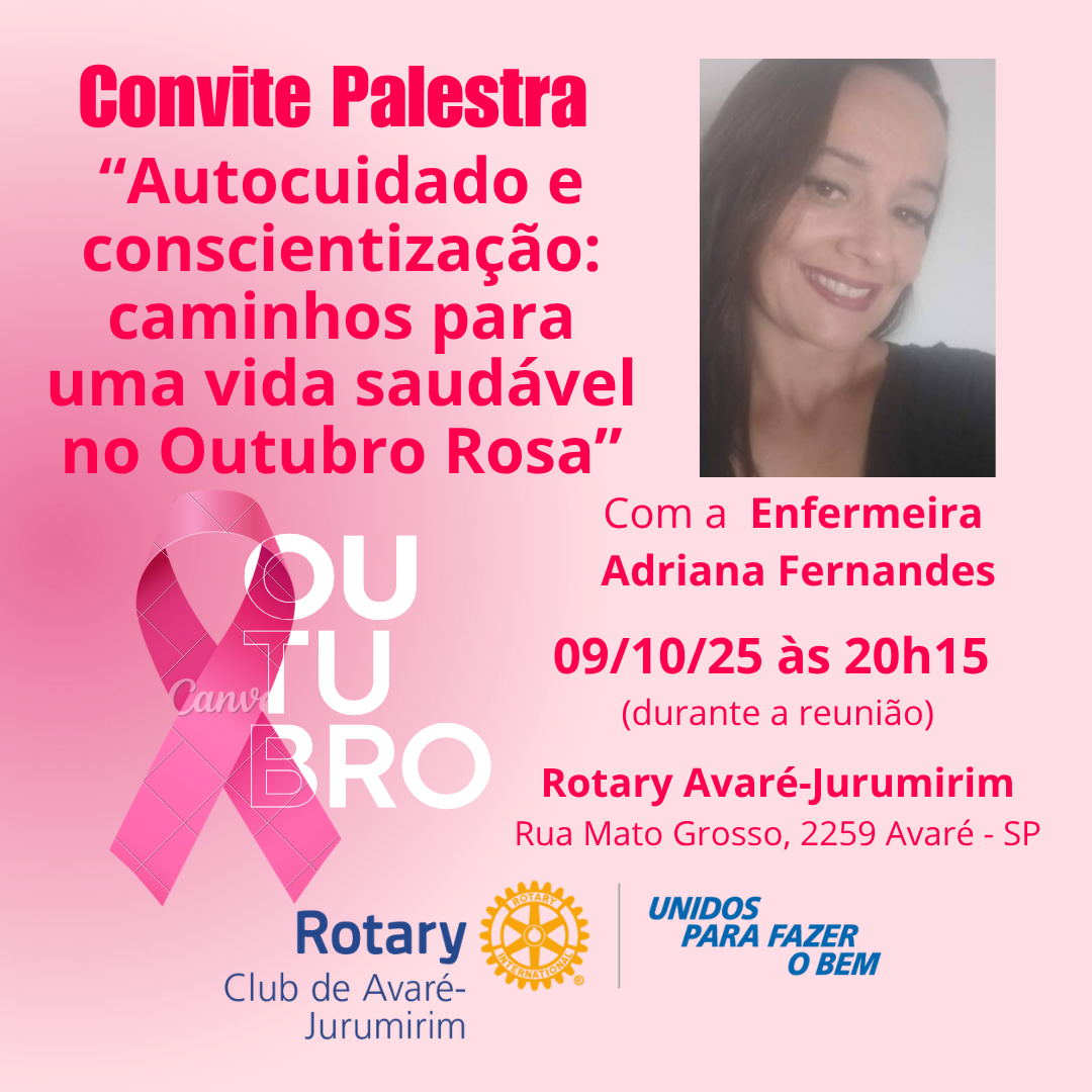 No próximo dia 09, quinta feira, durante a reunião semanal, será realizada palestra com a Enf. Adriana Fernandes, docente do Curso de Enfermagem da @uneduvale, que abordará o tema "Autocuidado e Conscientização: Caminhos para uma vida saudável" , em referencia ao Outubro Rosa.