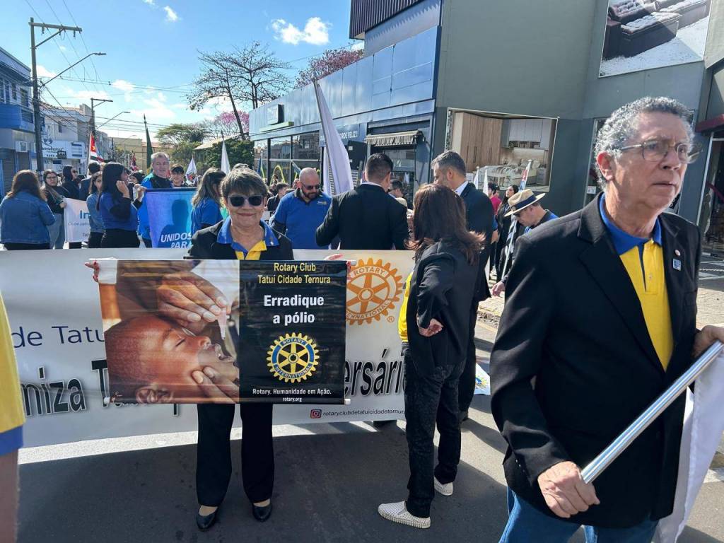 No dia 11 de agosto de 2025, os associados do Rotary Club de Tatuí-Cidade Ternura participaram ativamente do tradicional Desfile Cívico em celebração ao aniversário da cidade de Tatuí. A presença expressiva da população abrilhantou o evento, que contou com diversas instituições representando o espírito comunitário e o orgulho local. Durante o desfile, os rotarianos tiveram a oportunidade de divulgar amplamente a marca Rotary, reforçando seu compromisso com ações humanitárias e de impacto social. Um dos principais focos da participação foi a promoção do combate a Pólio, destacando a importância da erradicação da poliomielite no mundo. A iniciativa visou sensibilizar a comunidade sobre a relevância da vacinação e do engajamento coletivo. A presença do clube no evento reafirmou seu papel ativo na sociedade tatuiana, promovendo valores de cidadania, solidariedade e serviço. A ação também fortaleceu a visibilidade das causas rotárias perante o público.