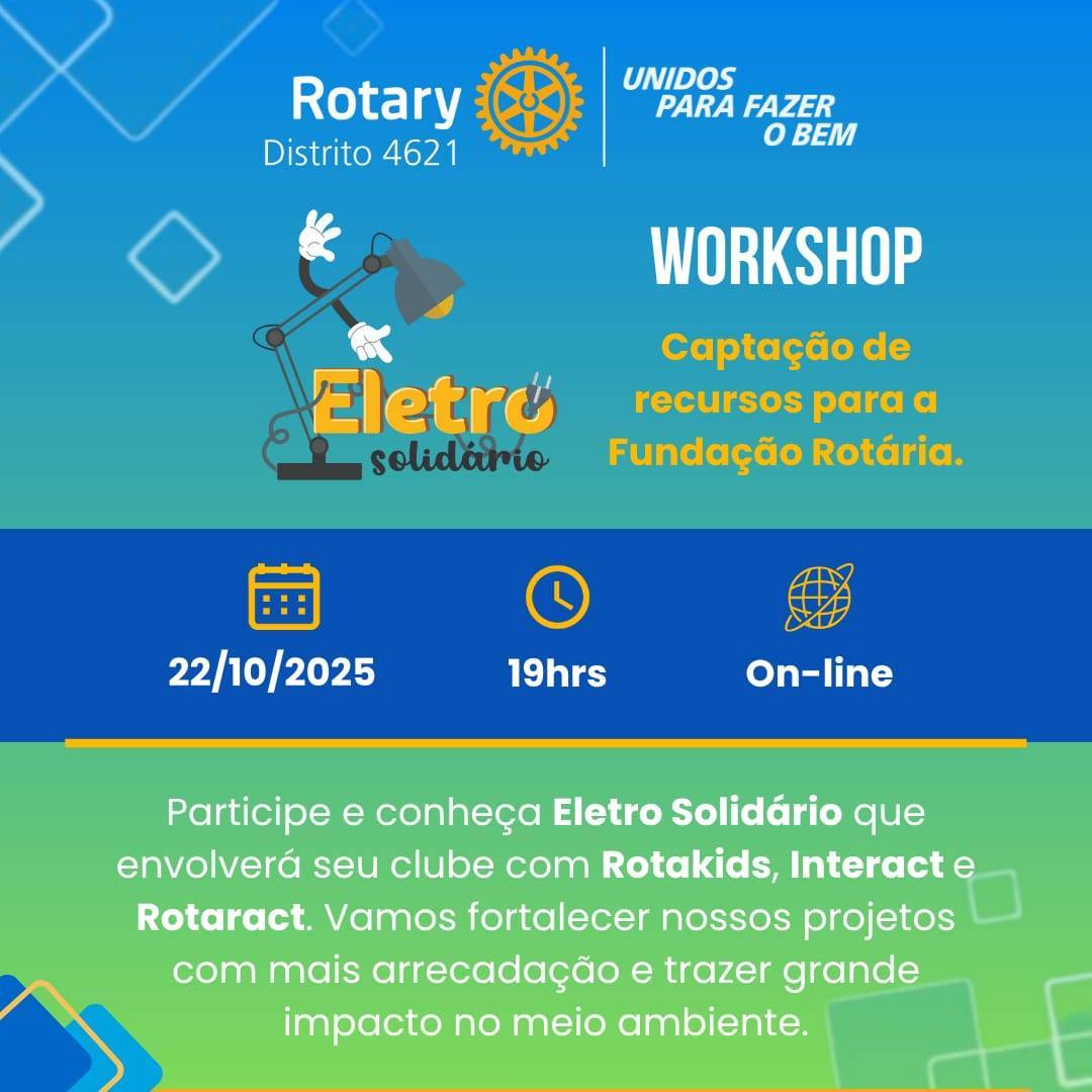 Em nome da governadora do Distrito 4621 Márcia Brito, e a pedido das comissões da juventude e da Fundação Rotária, fazemos o convite para o Lançamento Oficial do Projeto: Eletro Solidário.