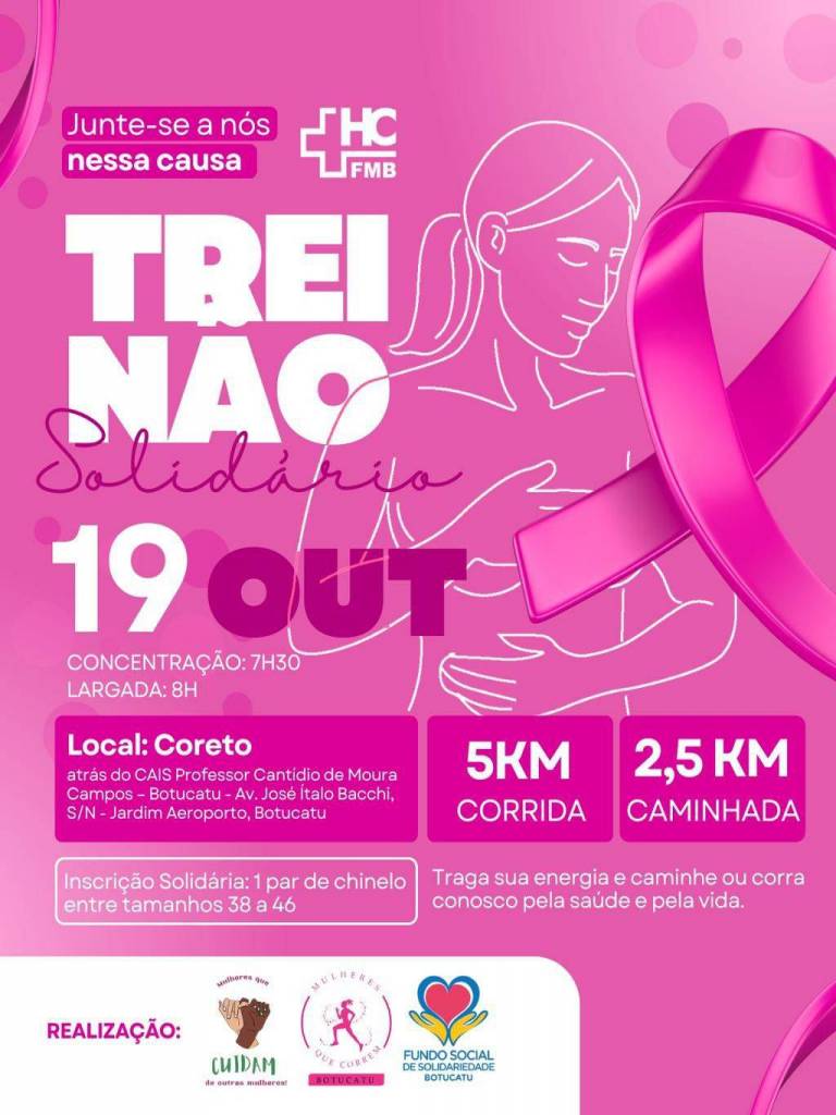No dia 19 de outubro, os projetos “Mulheres que Correm” e “Mulheres que Cuidam de Outras Mulheres”, em parceria com o Serviço de Radioterapia do Hospital das Clínicas da Faculdade de Medicina de Botucatu – Unesp (HCFMB), promoveram um Treinão Solidário em alusão ao Outubro Rosa, movimento que reforça a conscientização sobre a prevenção e o diagnóstico precoce do câncer de mama.
