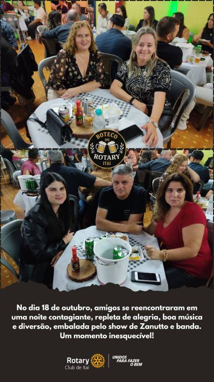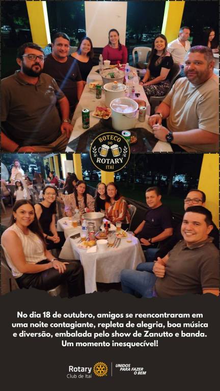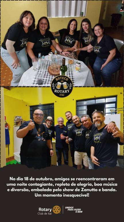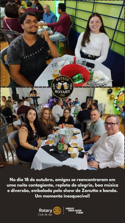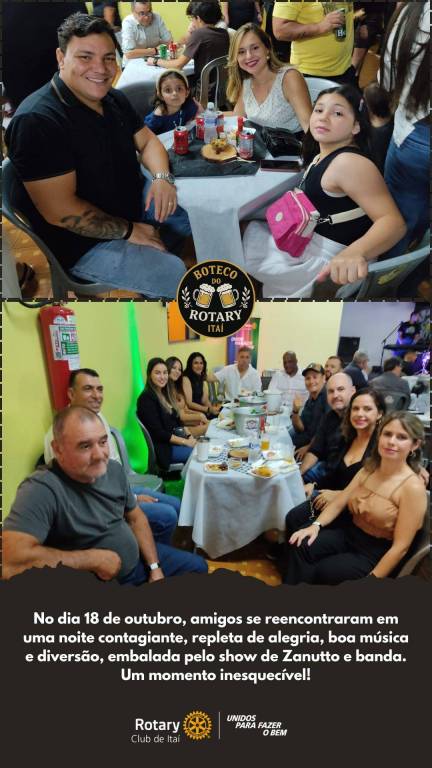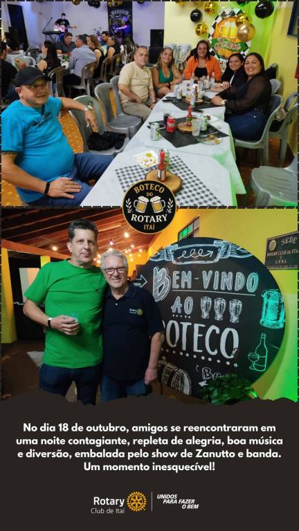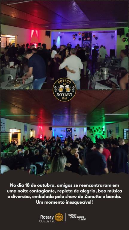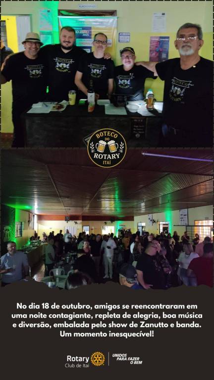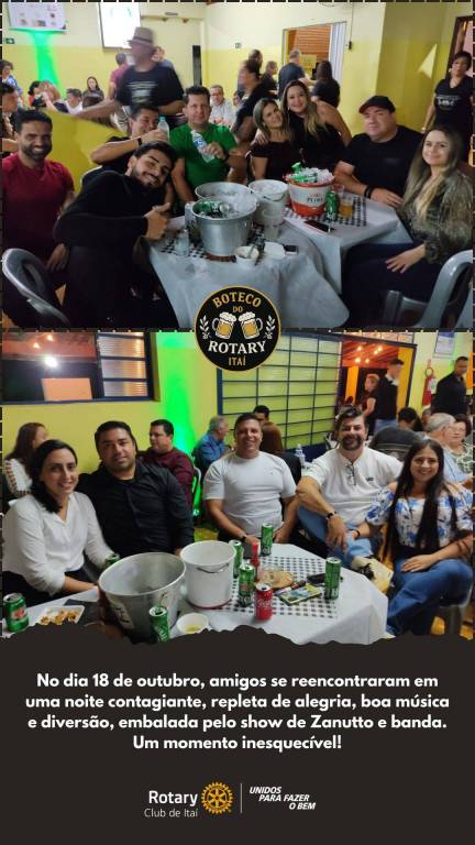 No sábado, 18 de outubro, o Boteco Rotary Itaí reuniu companheirismo, alegria e muita animação. A noite foi marcada pela magia da amizade, que uniu todos em um clima de descontração.