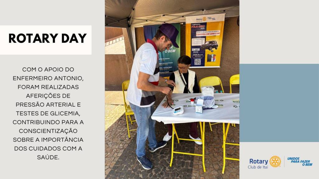 Na Praça da Matriz, foi montada uma tenda para o Rotary Day, onde mais de 80 pessoas participaram de aferições de pressão arterial e glicemia.