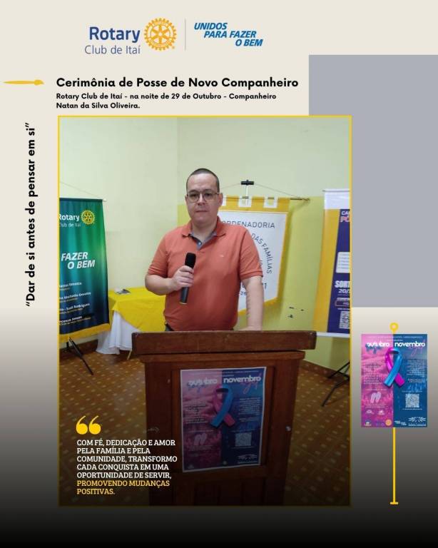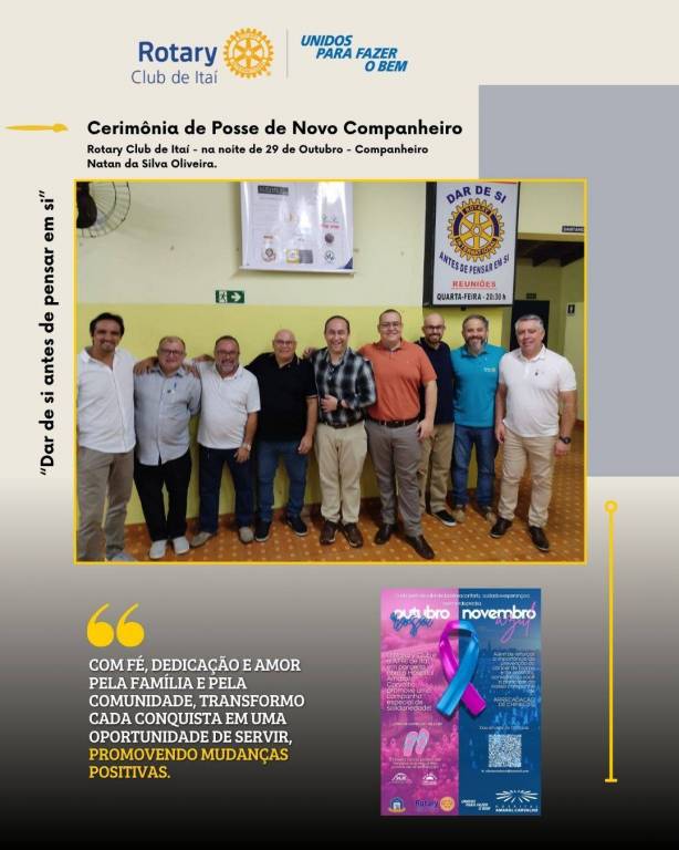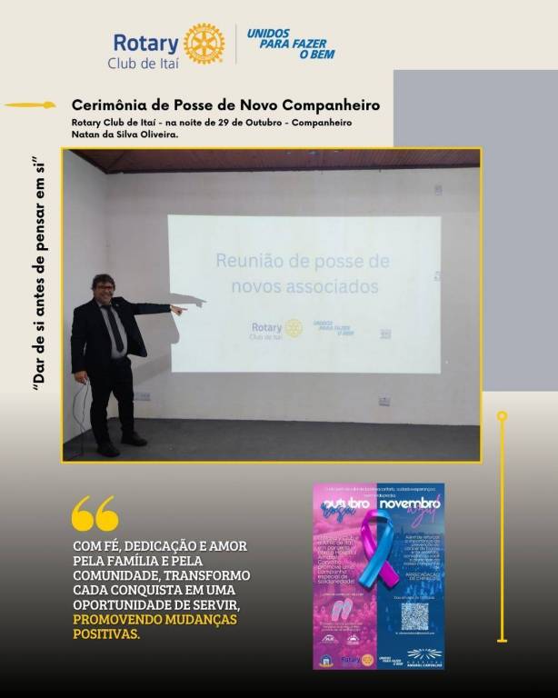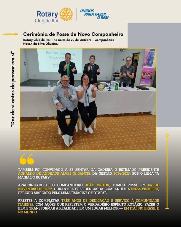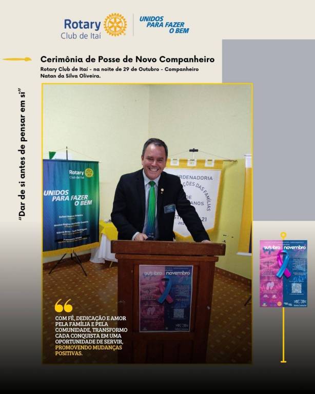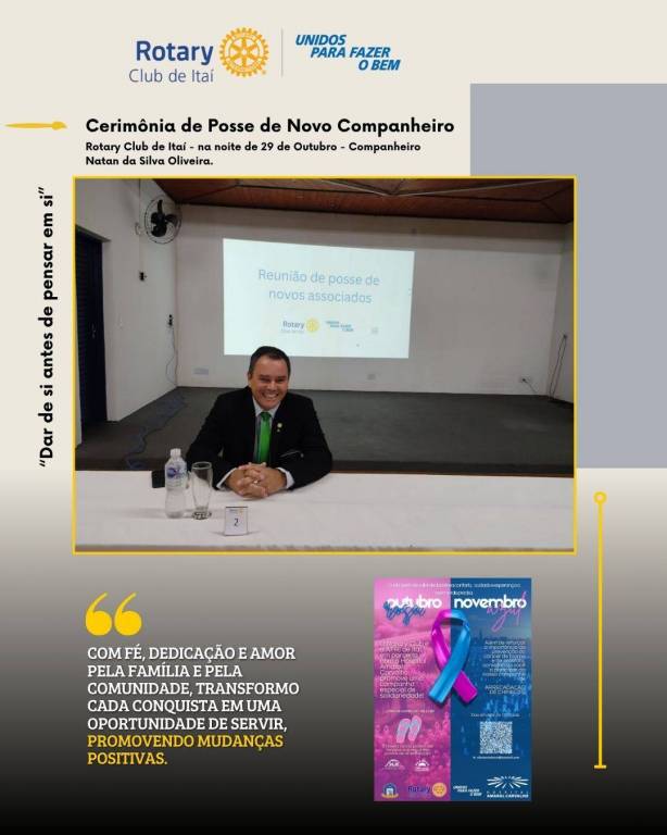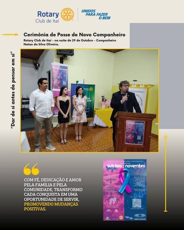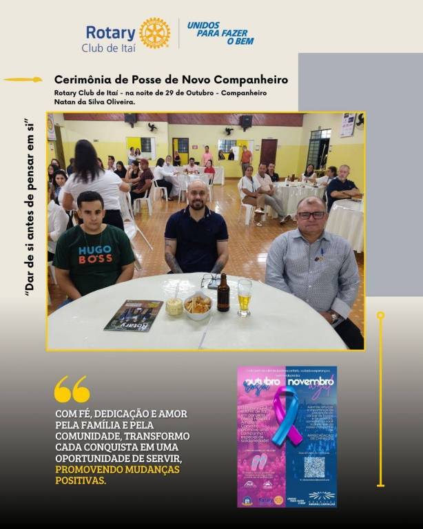 Rotary Club de Itaí, na noite de 29 de outubro, realizou uma cerimônia de posse do novo companheiro Natan da Silva Oliveira.